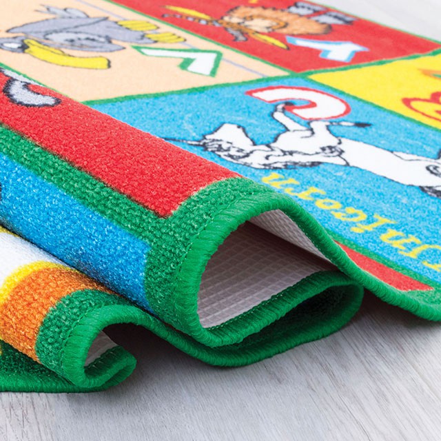 The kids will love this colorful rug! Each piece is made of 100% high quality soft nylon with non-slip cross pattern backing for hard surfaces. The kids will for sure roll around these rugs, so they feature a thick cushioned gel backing for extra comfort. A new 16-color combo technology was utilized to create bright and vivid details. Light weight for easy cleaning, the surged edges are reinforced for durability.