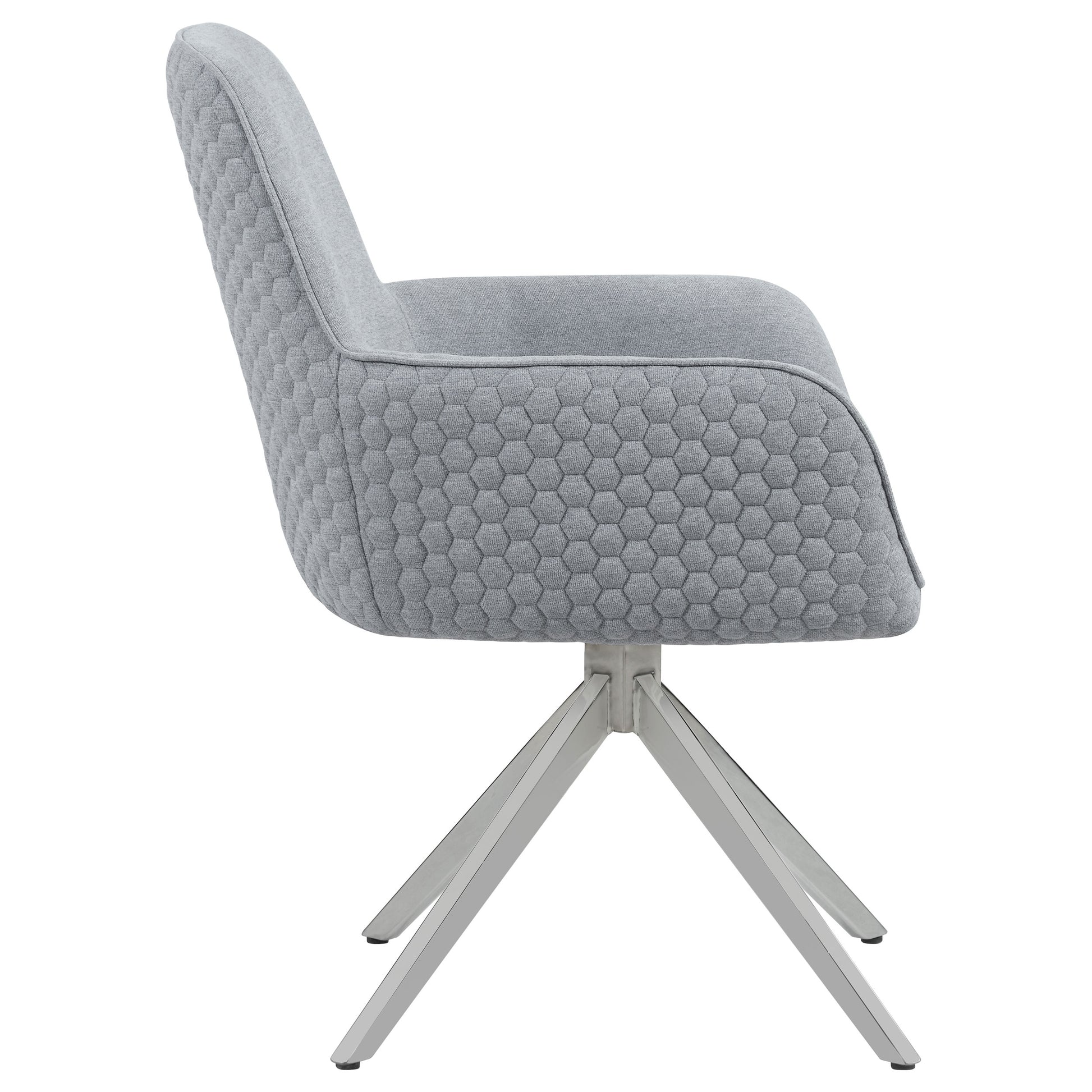 Blending mid-century modern design with contemporary comfort, this swivel dining armchair offers both style and function. Upholstered in light grey fabric, it features a plush bucket seat with low arms and a tall backrest for exceptional support. The honeycomb-quilted exterior adds texture and sophistication, while the 360-degree swivel base in a sleek chrome finish ensures smooth mobility. Perfect for casual or formal dining, this chair enhances any modern space with its elegant and practical design.