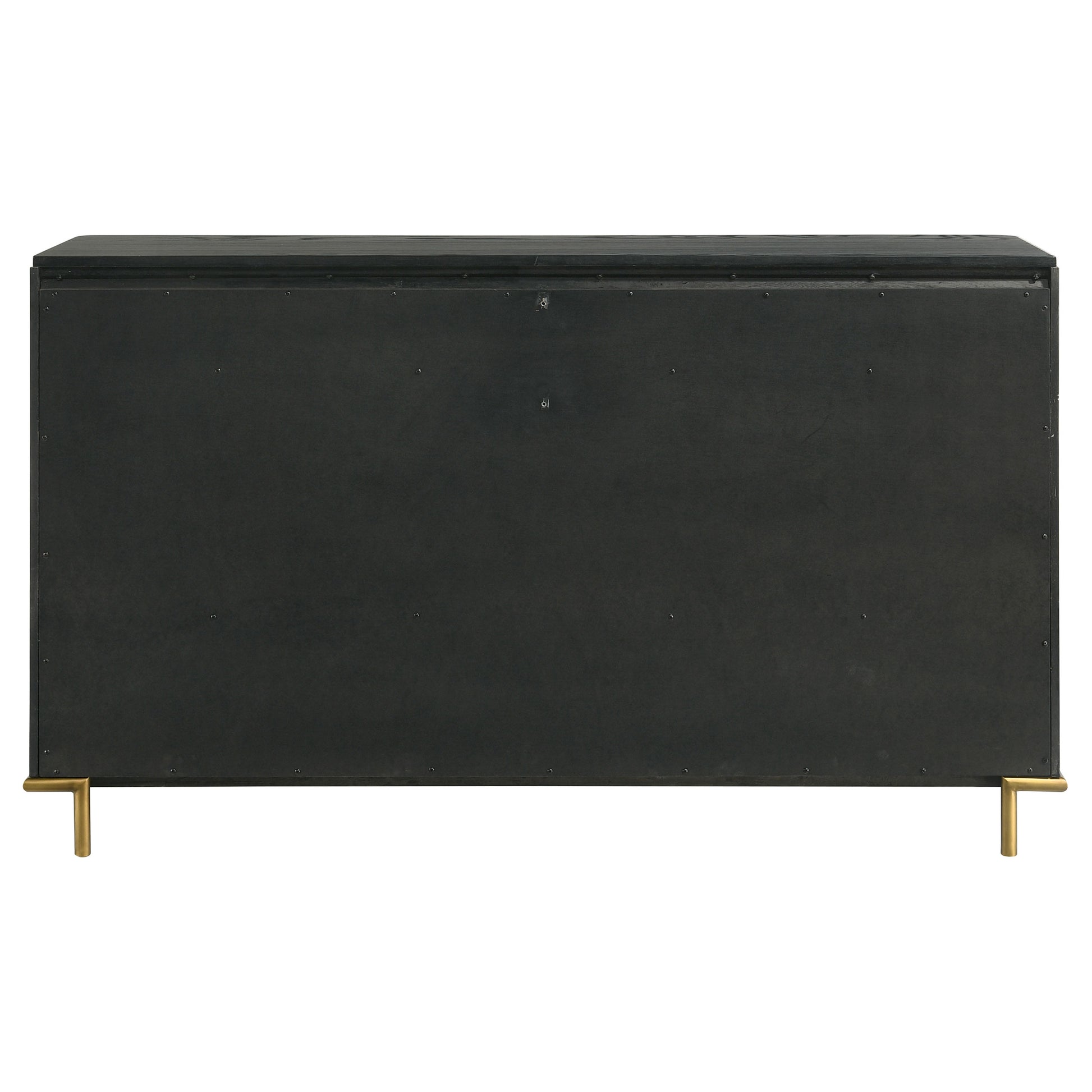 Graceful lines are enhanced with the wire brushed finish and wood grain details of a modern dresser. Eight drawers create ample storage and organization for clothing and linens, helping to keep your bedroom tidy and organized. Top drawers are lined with felt to offer protection for delicates and other precious items. Each drawer features English dovetail joinery and is complemented with a pair of round ball knobs in a muted gold finish that perfectly matches the legs of the piece. Use the wide top for decor to create a vanity space perfect for morning beauty rituals.