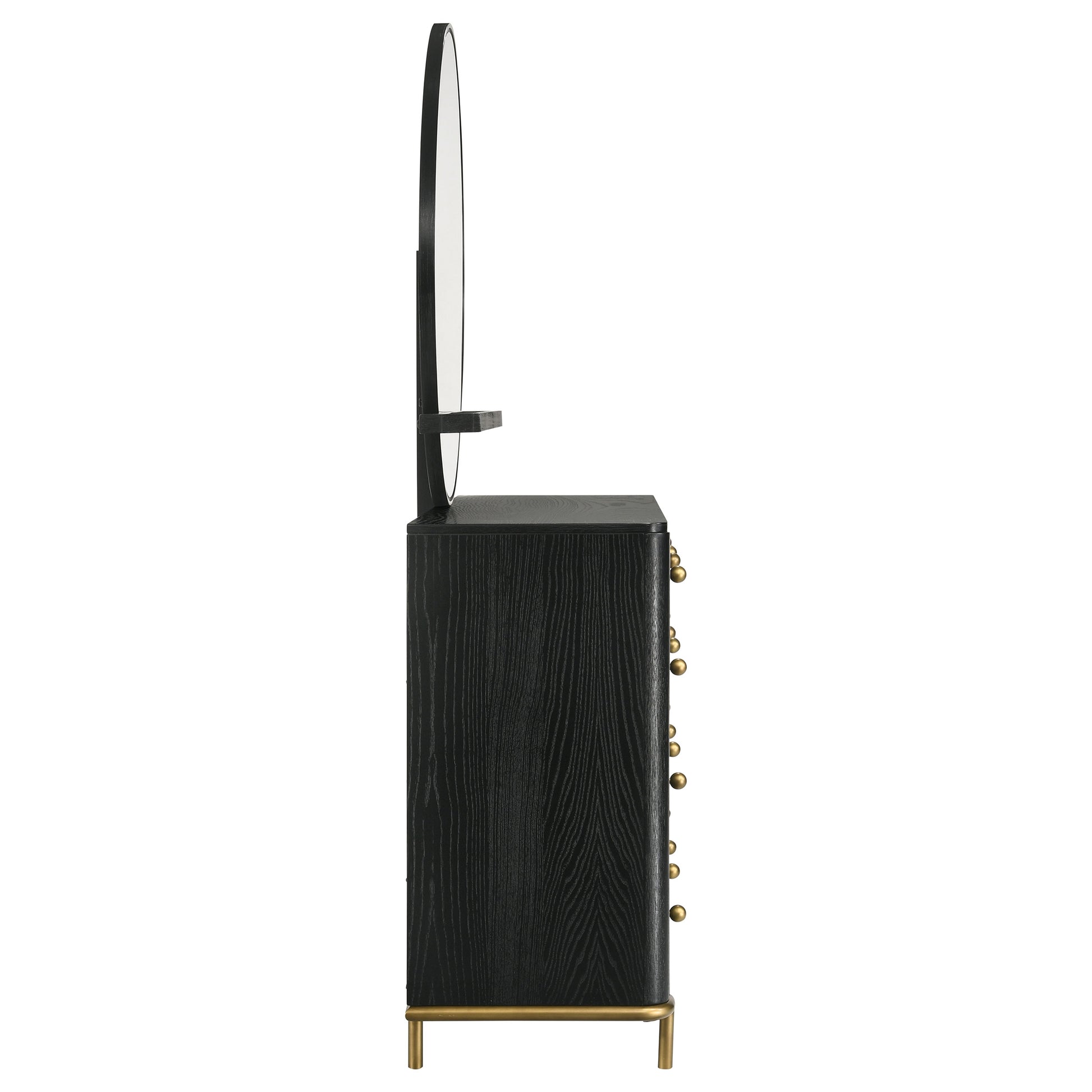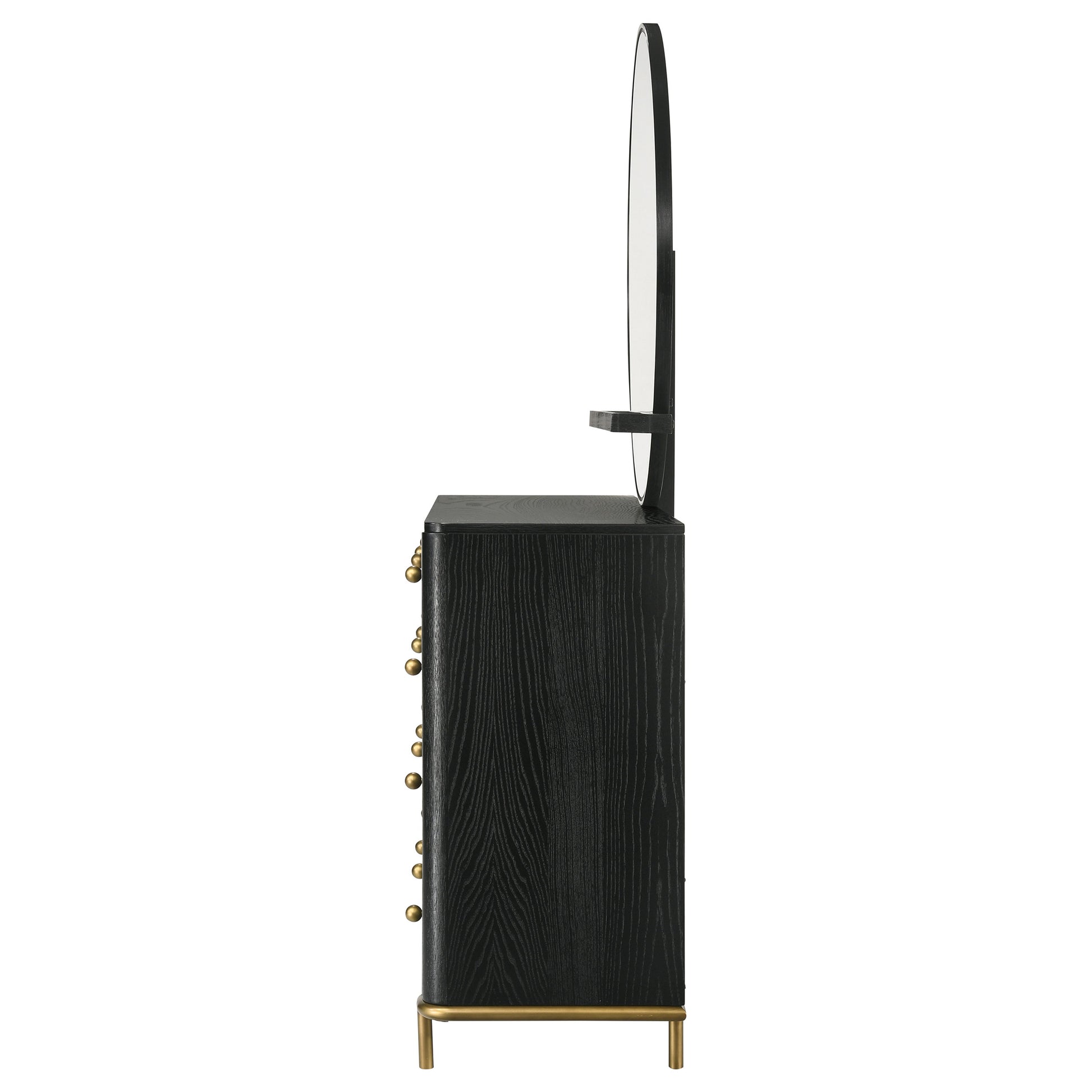 Upgrade clothing storage in your bedroom or dressing area with a modern eight-drawer dresser. Its dark brown wood grain finish is deep and warm, perfect for a variety of spaces. It's augmented with gold finish knobs and legs, offering the perfect dose of warmth and contrast. The dresser includes felt lining in its top drawers, great for delicate items. A wide top is complete with a round mirror and compact jewelry tray, offering a hint of delicacy and engaging character.