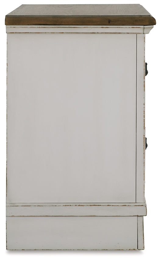 Traditional design. Casual appeal. You can have it all with this nightstand. A relaxed two-tone aesthetic merges with ornate profiled drawer fronts and pilasters to give the distinctive piece an allure all its own. Expansive drawers with quality dovetail construction and dark bronze-tone hardware reflect attention to detail from the inside out.