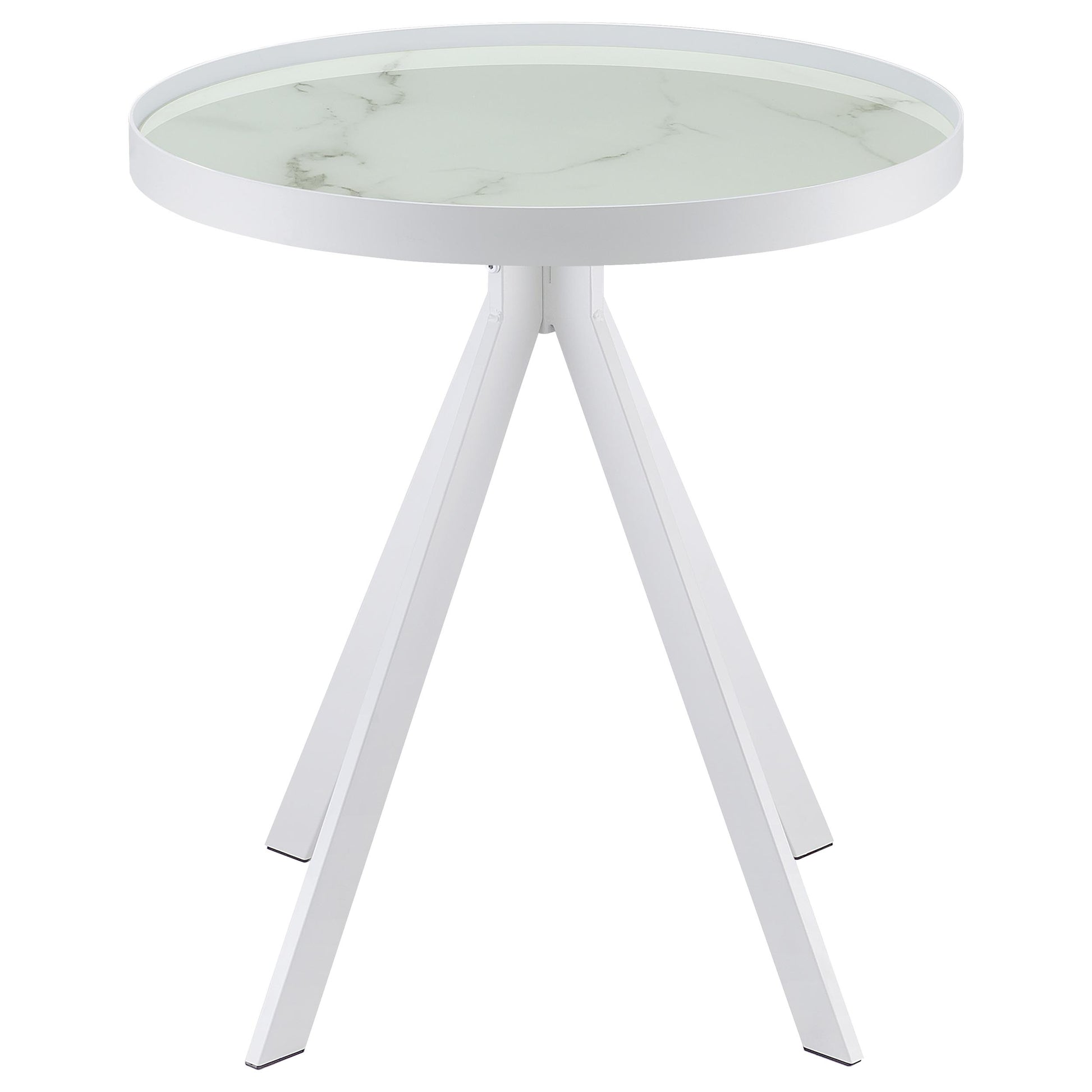 This modern round end table combines durability and elegance with its tempered glass top featuring a marble-patterned print. Supported by a sturdy four-legged metal frame, its minimalist design adds sophistication to any room. Perfect for use as an accent table in living rooms, bedrooms, or offices, it blends functionality and style effortlessly while offering a durable surface for daily use.