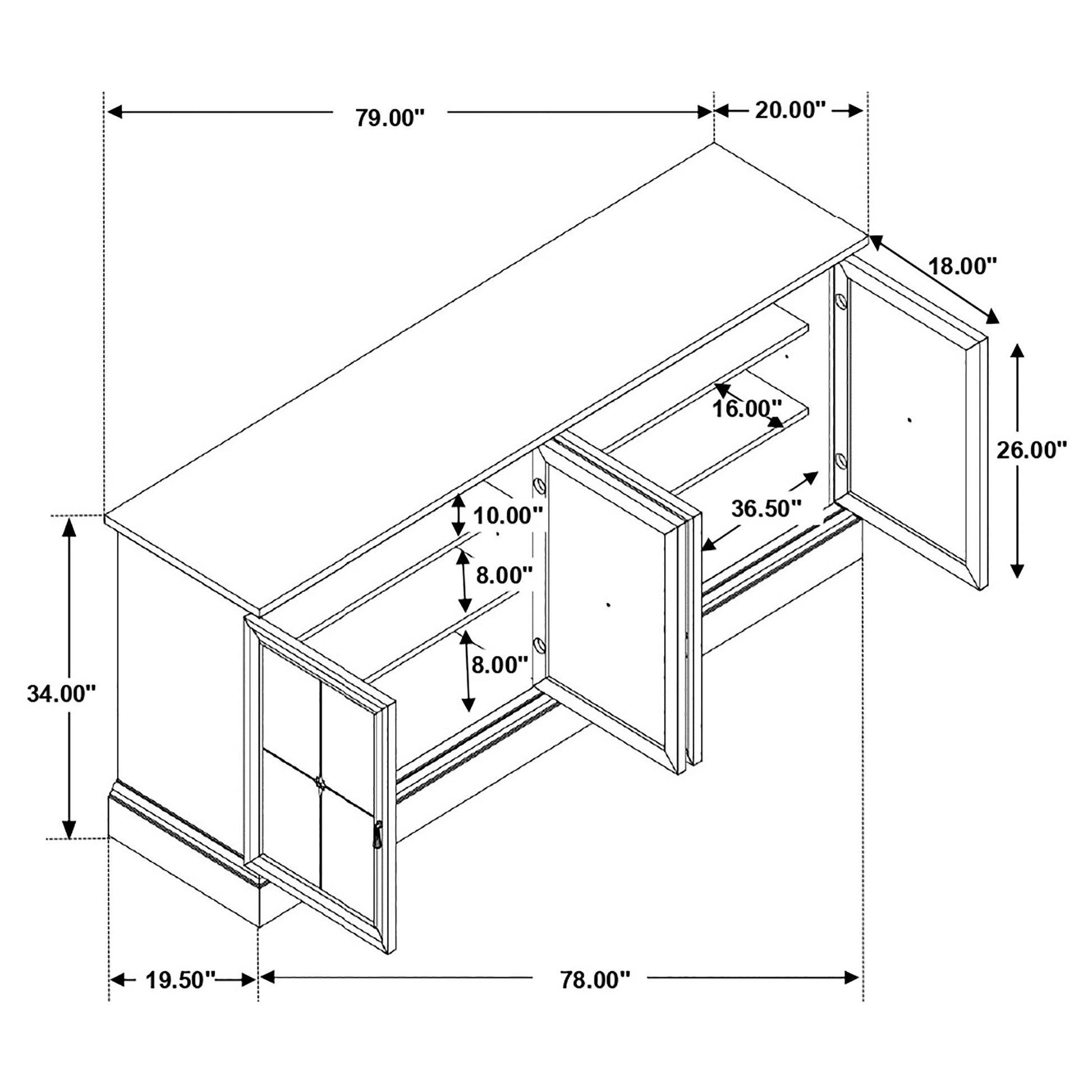• Dining sideboard features four antique mirrored doors with adjustable interior shelving