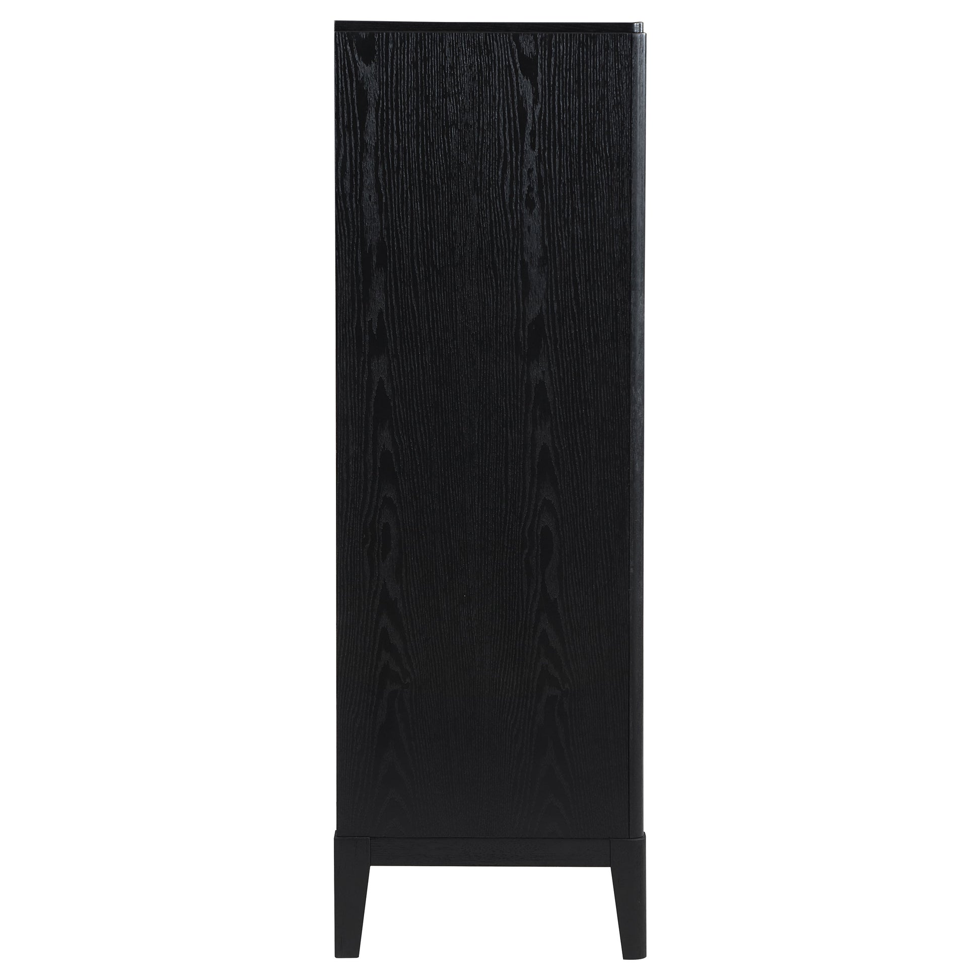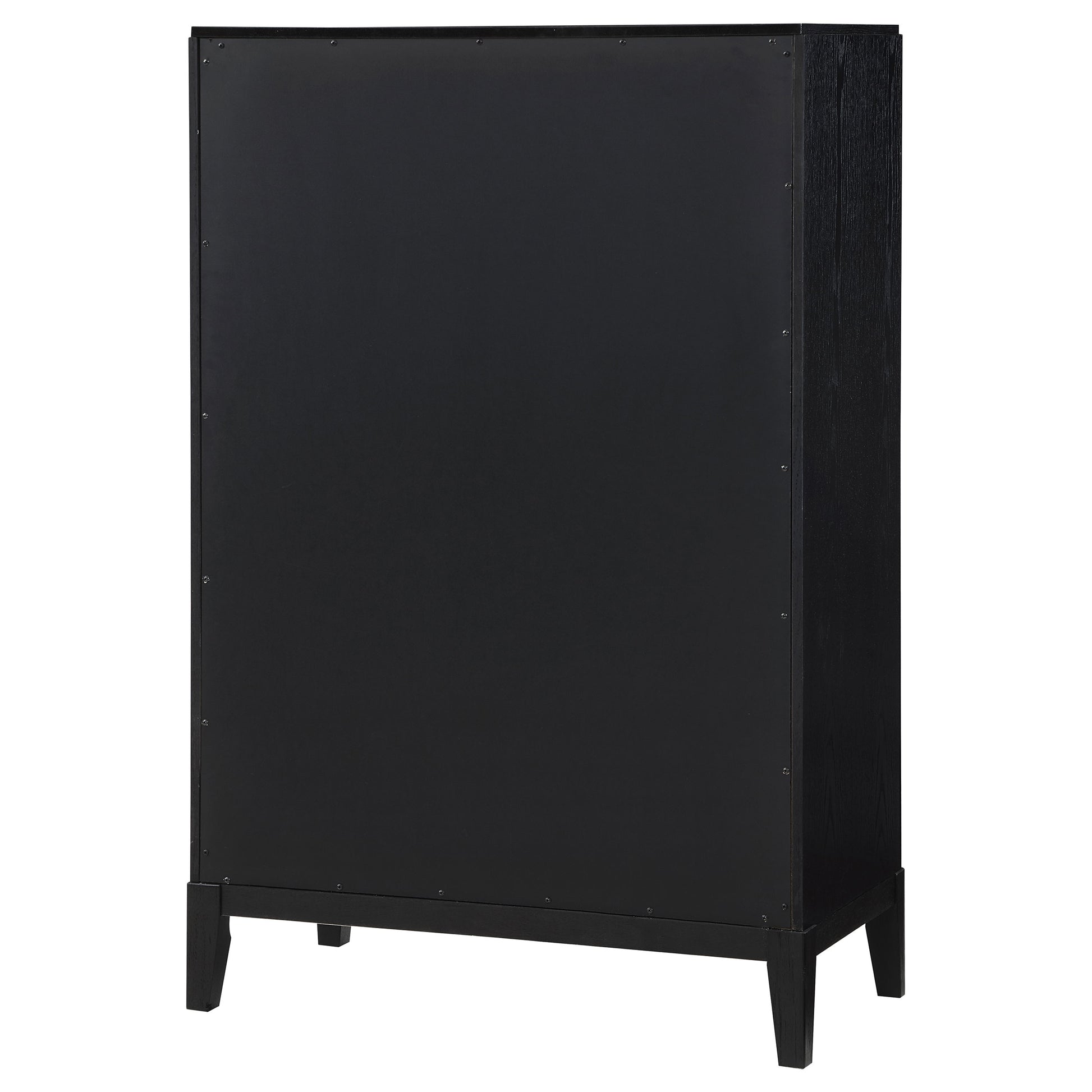 Add abundant clothing and accessory storage in a stylish bedroom with this modern five-drawer chest. Its compact profile fits virtually anywhere, while a chic look is created with fluted drawer fronts that add impressive dimensionality. A black finish imparts sophistication, while wire brushing creates a subtle sense of texture and depth. Each drawer front is adorned with a half-moon handle in a soft golden metallic finish that adds a perfect hint of warmth. The top drawer of the chest adds felt lining, perfect for protecting delicate items.