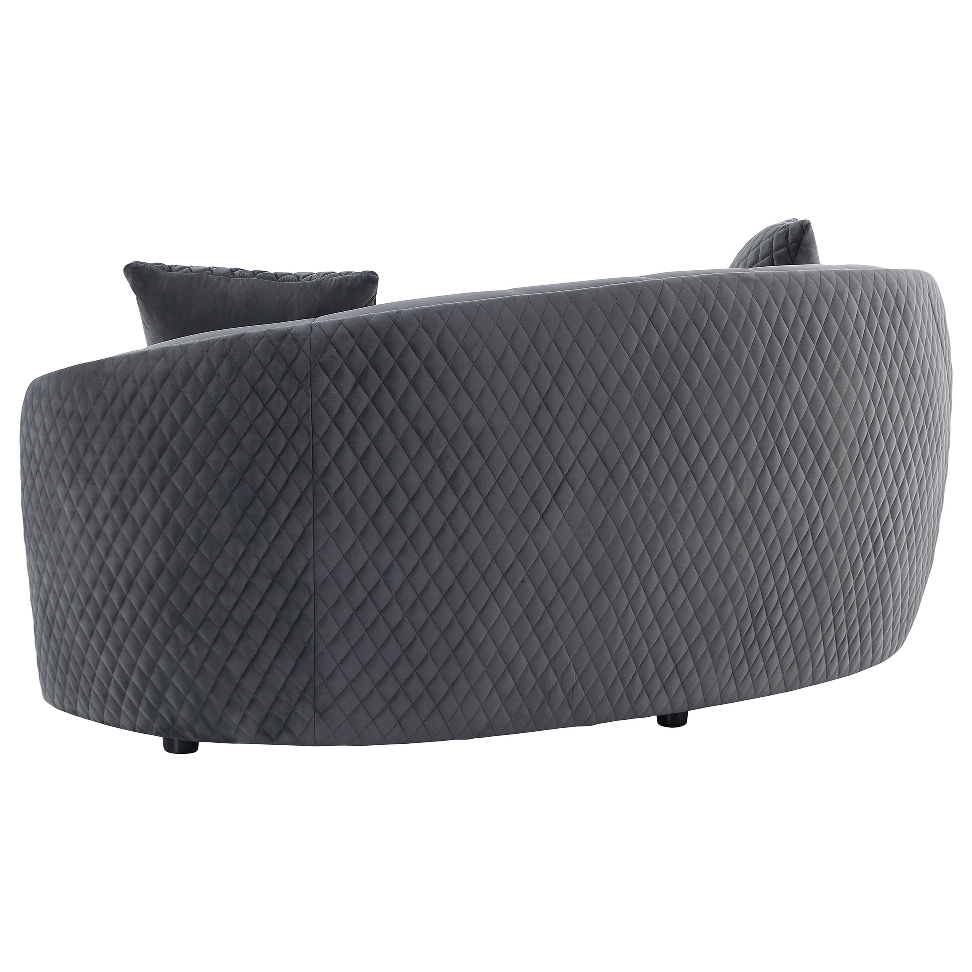 Put a sophisticated spin on living room decor with a modern two-piece sofa and loveseat set. Designed to impress, each piece boasts dark grey upholstery that's velvety soft and trimmed in gold that adds metallic gleam and warm contrast. The gentle curvature of the sofa and loveseat silhouettes bring elegant flair to your living room. The outer surface of the back and arms adds diamond texturing, while vertical channel tufting adds dimension to the interior of each piece. The sofa adds a gold ball accent pillow and two in matching grey, while the loveseat includes two pillows in grey for added comfort.