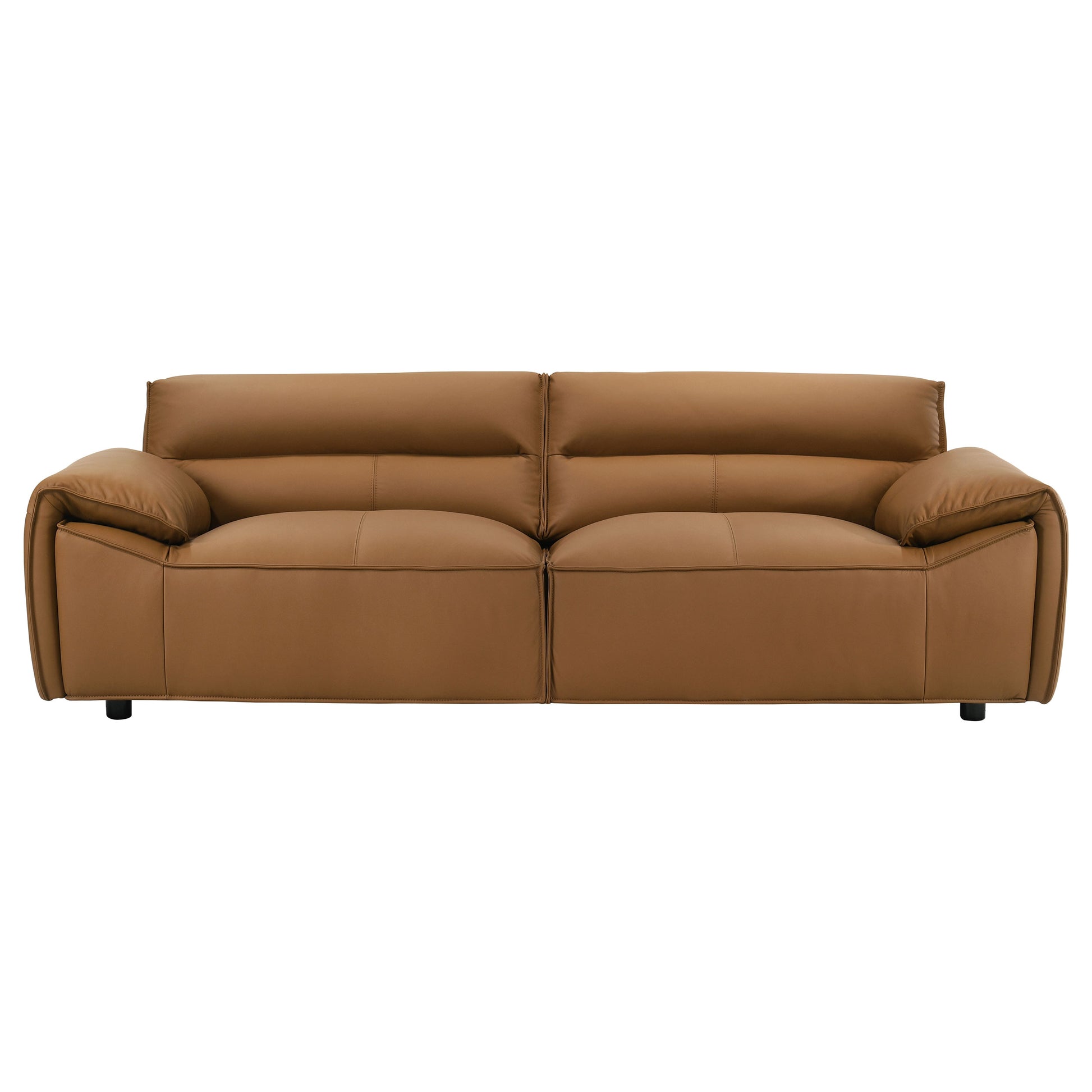 Sleek and sculptural, this leather-upholstered sofa blends minimalist form with elevated comfort. Wrapped in 100% genuine top grain leather, it offers a luxurious hand and timeless presence. Wide track arms and a low-profile frame shape a bold, architectural silhouette, while deep seating and padded back cushions provide an inviting place to unwind. Built with sinuous spring support and high-density full foam seating, it delivers lasting comfort wrapped in tailored sophistication.
