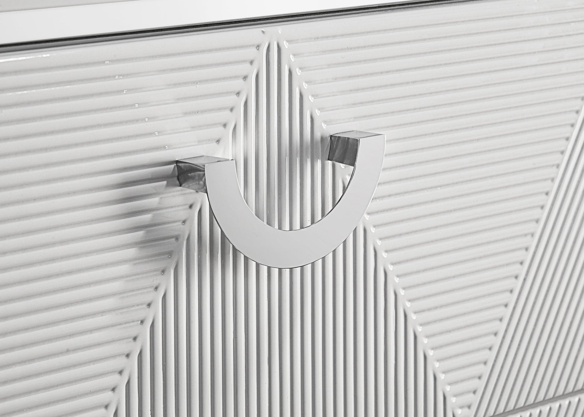 Sleek and sculptural, this six-drawer dresser pairs crisp white high gloss with dimensional detail for a bold modern look. Its geometric drawer fronts feature ribbed textures forming inverted V patterns, highlighted by polished chrome U-shaped pulls. Felt-lined top drawers add a refined interior touch, while smooth-gliding drawers operate on 45mm metal extension glides hardware. Finished with slender legs and clean lines, this dresser brings texture and brightness to contemporary bedrooms.
