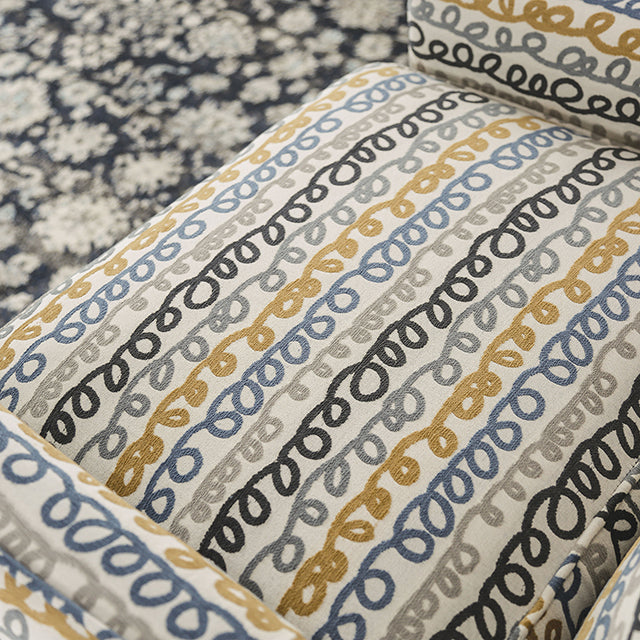 Simplicity is the name of the game with this chair. Pops of colorful and playful lines are found, giving this chair a friendly and approachable personality--the navy and gold accents popping against the neutral gray linen-like fabric.