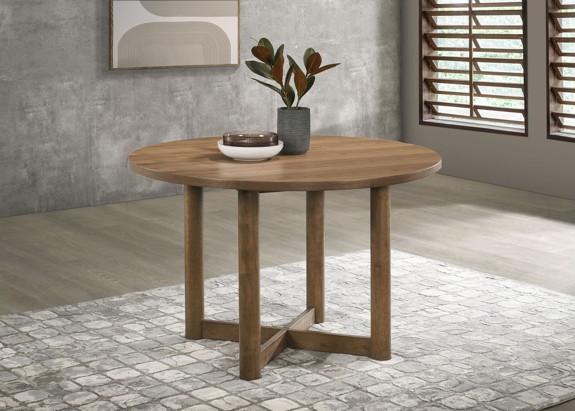 Embrace casual dining with the inviting ambiance of a modern round dining table. Crafted with a walnut finish over walnut veneer, it's a delightful centerpiece in a welcoming kitchen or dining room. Its round silhouette creates a unifying ambiance, perfect for seating four in comfort. The table boasts round post legs with an X-cross base that adds the perfect hint of visual dimension and texture. Choose flowers from the garden or seasonal decor for a charming finishing touch.