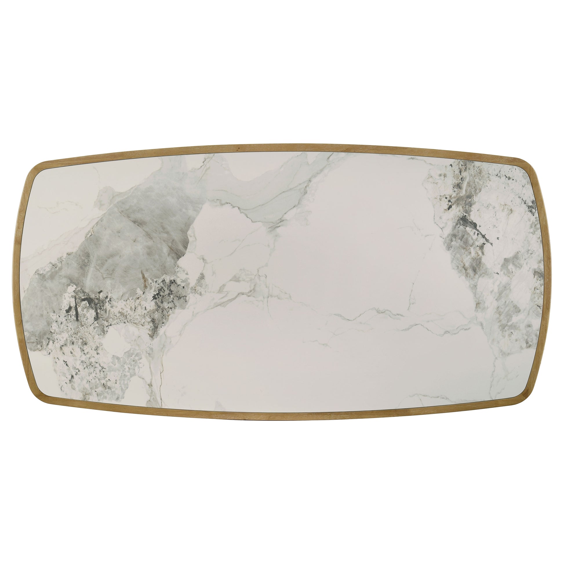 • Rectangular dining table with ceramic inset top and mid-century inspired frame silhouette