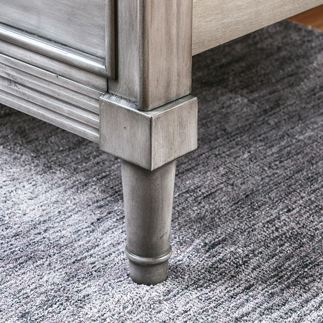 In addition to stunning carved details and felt-lined top drawers, this transitional style bedroom collection comes with built-in headboard shelves and convenient touch lights. An extra drawer hides within the night stand and dresser while the chest offers extra functionality with its lift-top jewelry storage, complete with mirror. Sleek silver tone handles sparkle against the weathered gray finish for a beautifully contemporary design that will beautify any bedroom.