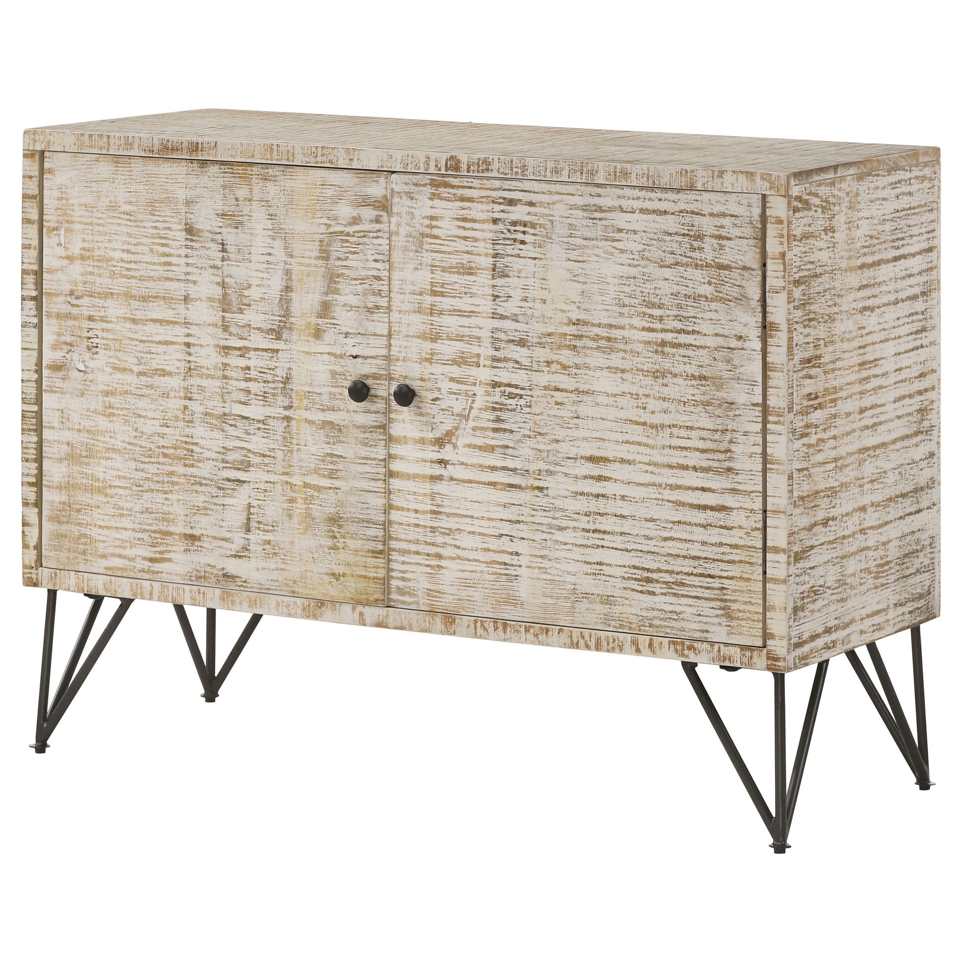 Bring a modern expression to your bohemian style space with this rustic industrial accent cabinet. A large and boxy, rectangular frame grounds a focal wall and welcomes a table lamp and decor along its narrow top surface. Double cabinet doors open up to reveal a roomy interior with plenty of space for sorting items you want to keep out of sight. Along each door, a tiny round metal knob offers a charming accent. With a raw, organic texture, this rustic accent cabinet makes a lovely addition to contemporary and coastal homes alike, offering a mid-century modern touch thanks to the slender gunmetal finished iron legs.