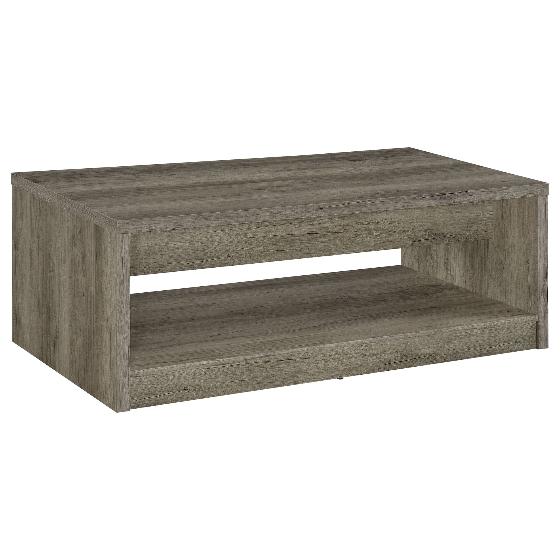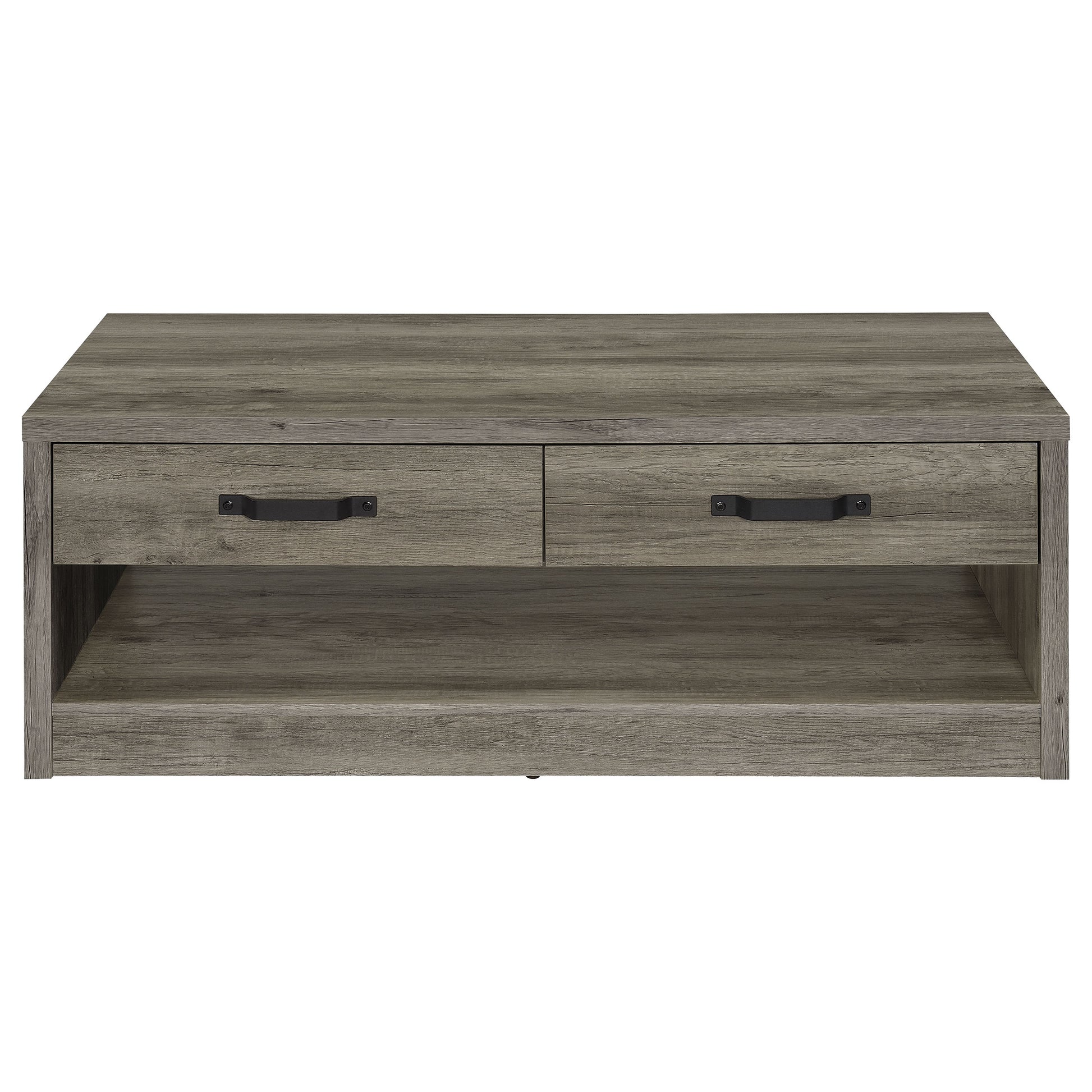 Enhance your living space with this rustic yet contemporary coffee table. Featuring a gray driftwood finish over engineered wood and scratch-resistant veneer, it boasts a natural wood-look design with realistic grain accents. The table includes two drawers with black metal handles for accessory storage and an open shelf for added utility. Its clean rectangular silhouette blends seamlessly into modern interiors, offering both style and functionality for everyday use.