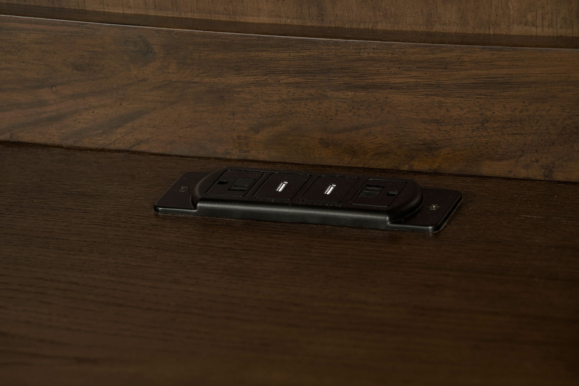 • Credenza includes a power outlet (2AC/2USB), center keyboard drawer, two top drawers and middle drawer with removable dividers, one lockable file cabinet, and a cabinet with an adjustable shelf