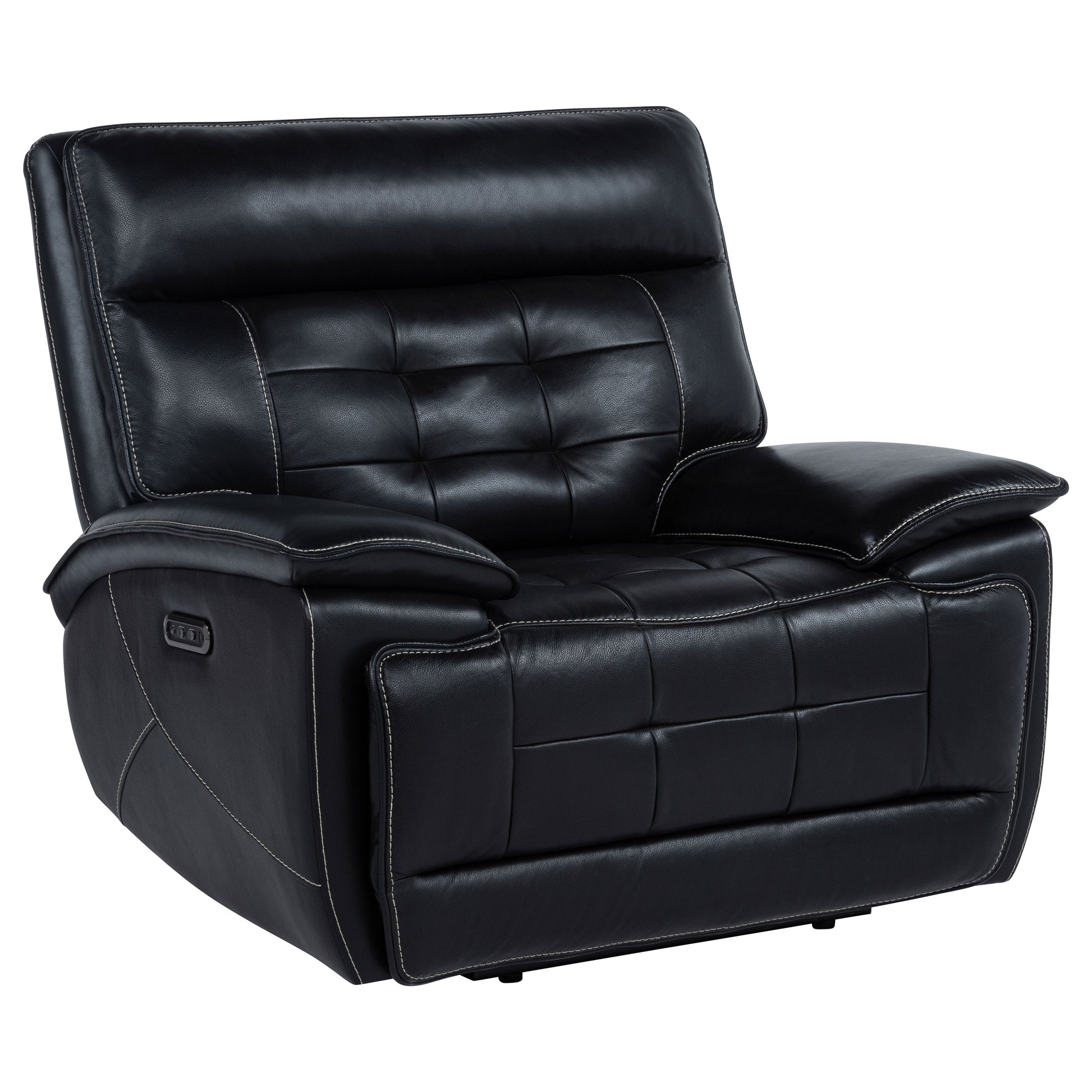 Commanding comfort and tailored power define this leather dual power recliner chair. Upholstered in black top grain leather everywhere the body touches, it features dual power controls for independent adjustment of the headrest and footrest. A built-in control panel includes dual USB ports with both USB-A and USB-C for effortless charging. Channel tufting and contrast stitching add refined dimension to its bold, supportive form.