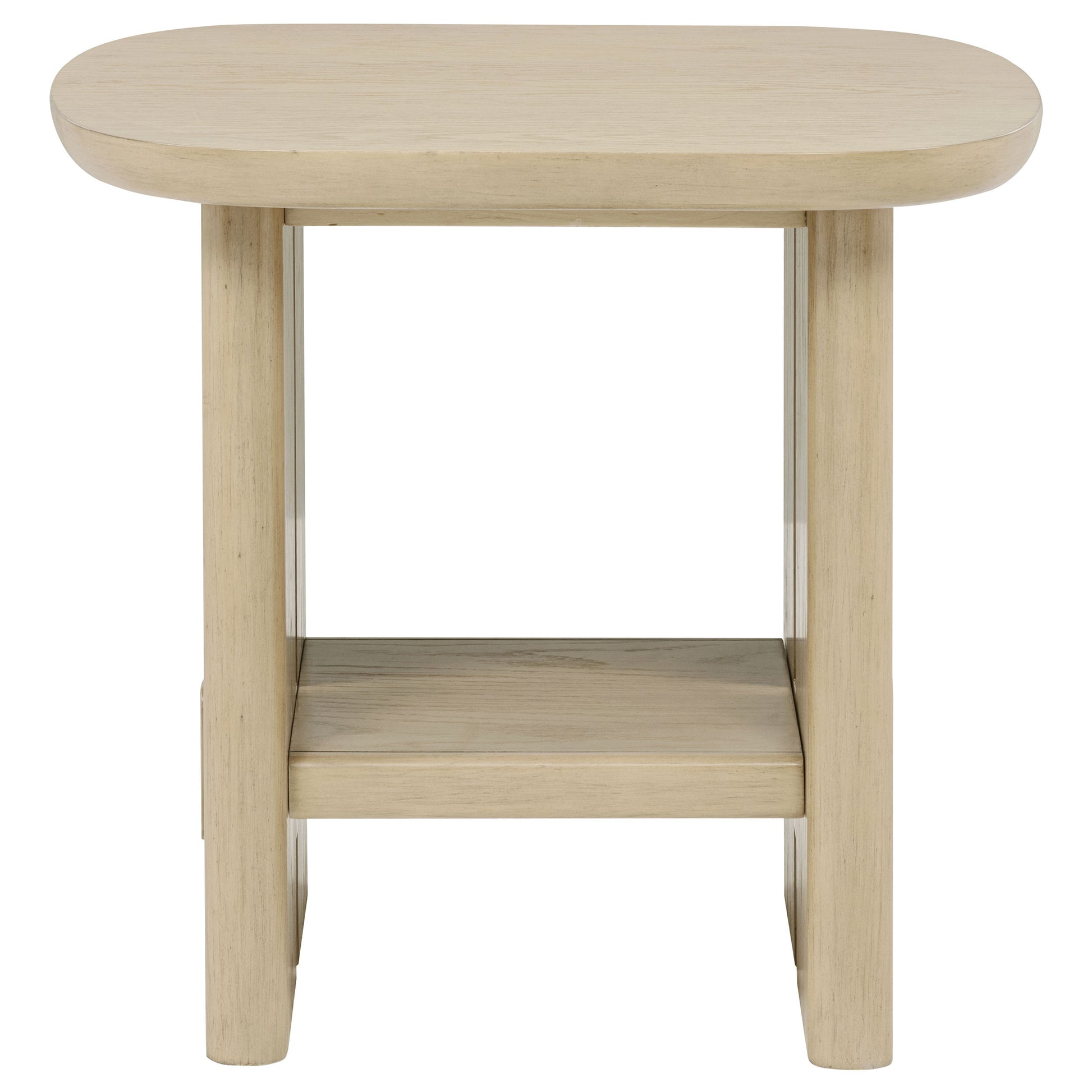 • End table with softly rounded square top and sculpted underside in beige oak veneer