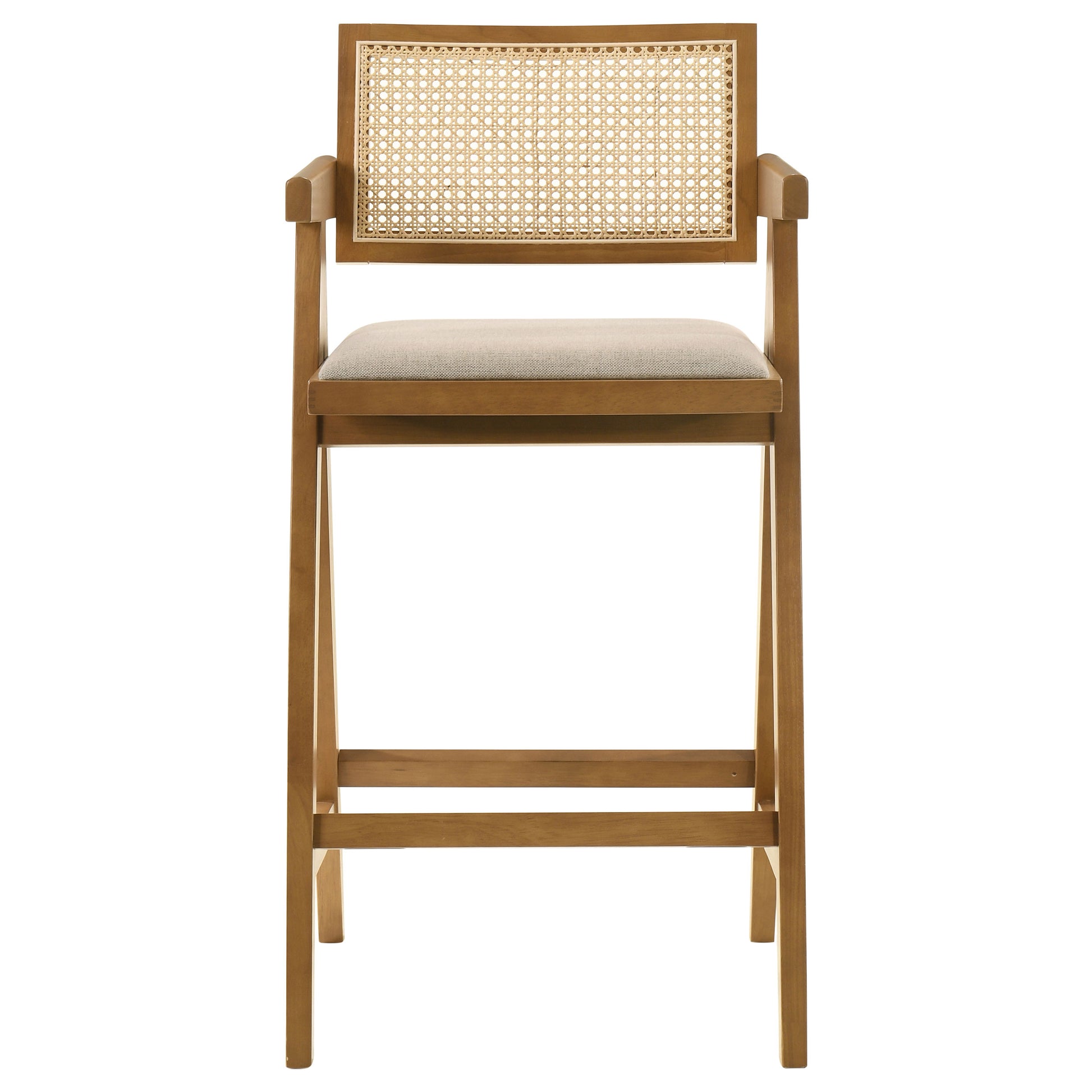 Make a statement at your kitchen island or bar table with a charming set of two mid-century modern barstools. Robust design pairs A-frame structuring with tapering armrests and a rectangular seat and back. Each stool is finished in light walnut and features an airy island vibe with a woven rattan back. The seats are covered in sand fabric upholstery for a fresh, light look and feel and plenty of comfort. Pair these barstools with a casual lounge with island ambiance or place them in an inviting kitchen for a chic look.