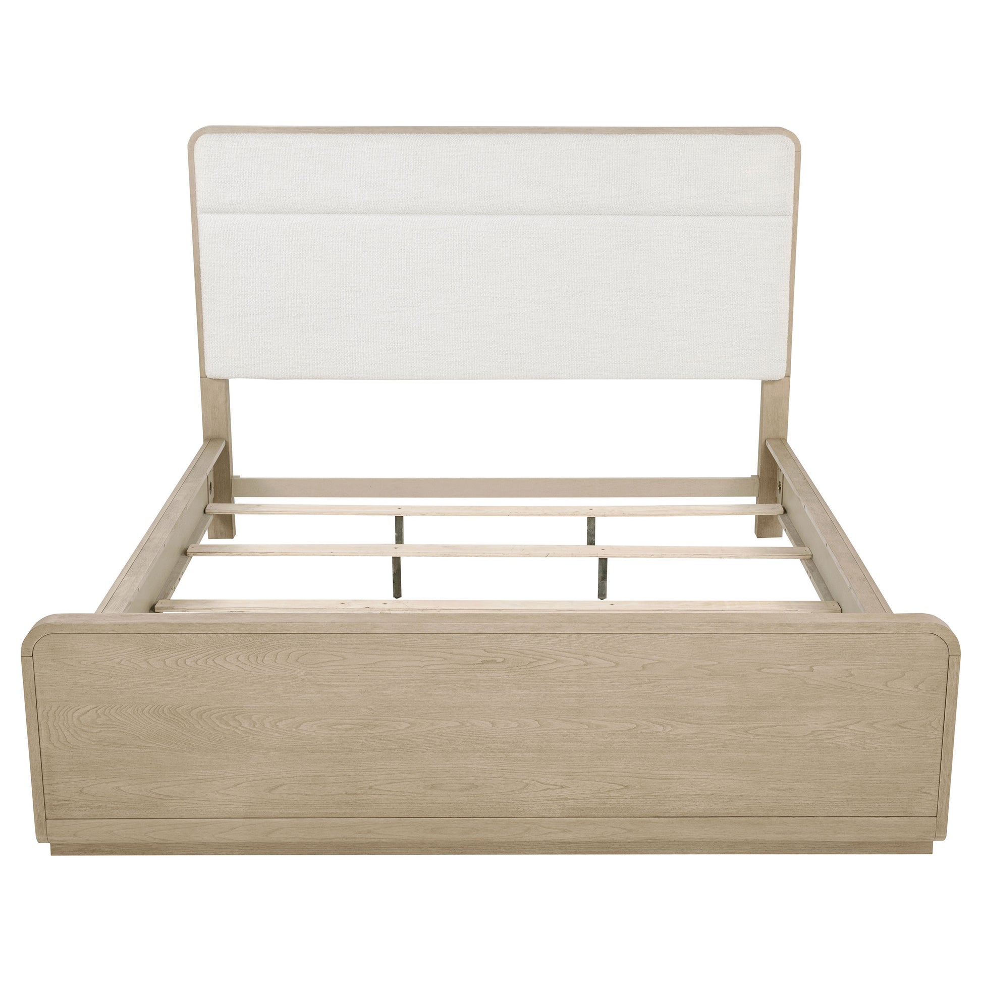• Cream boucle upholstered headboard adds a plush, teddy bear-soft texture for comfort