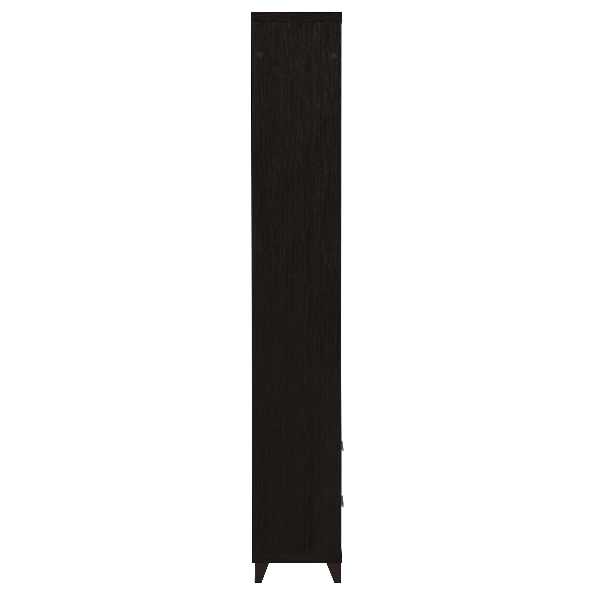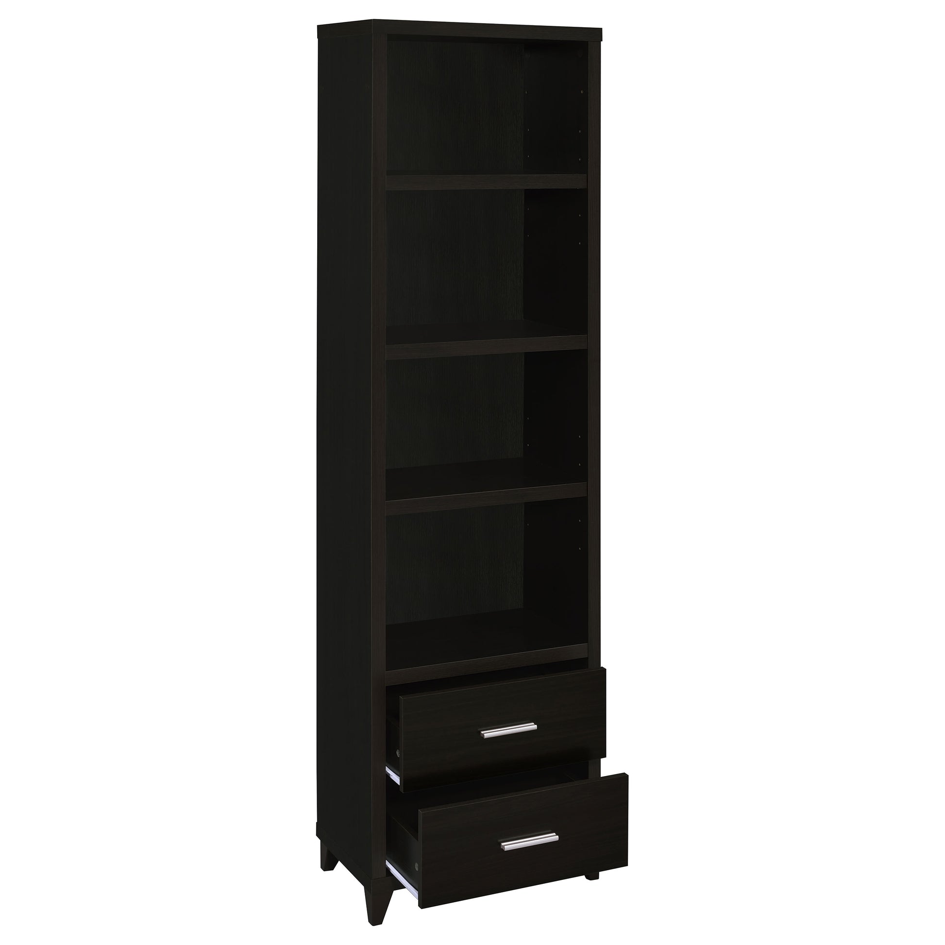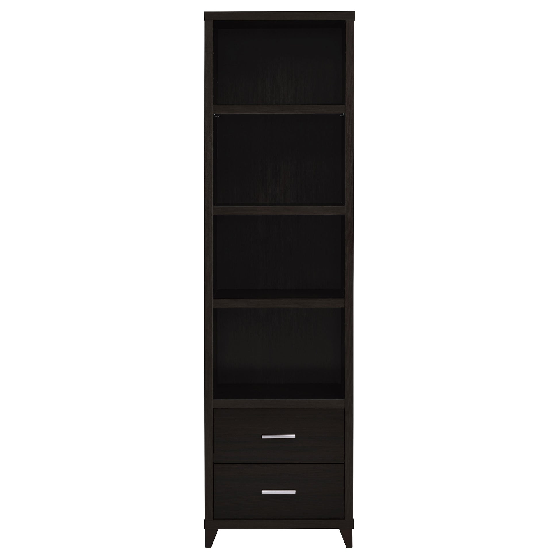 Elevate your entertainment area with this versatile media tower, designed with sleek lines and a cappuccino finish for contemporary appeal. Four open shelves provide ample space to display books, decor, or media devices, while adjustable shelving adds flexibility for customized storage. Two spacious drawers at the base keep accessories neatly tucked away, complemented by brushed silver hardware for a modern touch. Supported by tapered legs, this tower combines practical function with a stylish silhouette to complete your living space.
