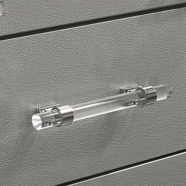Create a room with this bedroom set from the Maddie Collection. The curved headboard is padded and upholstered in a horizontally-tufted fabric, emphasizing the silver finish. The night stand, dresser, and chest feature acrylic legs, crystal accents, and a beveled mirror with a LED light creates a glamorous aesthetic. Give into your glitzy side with this opulent set.