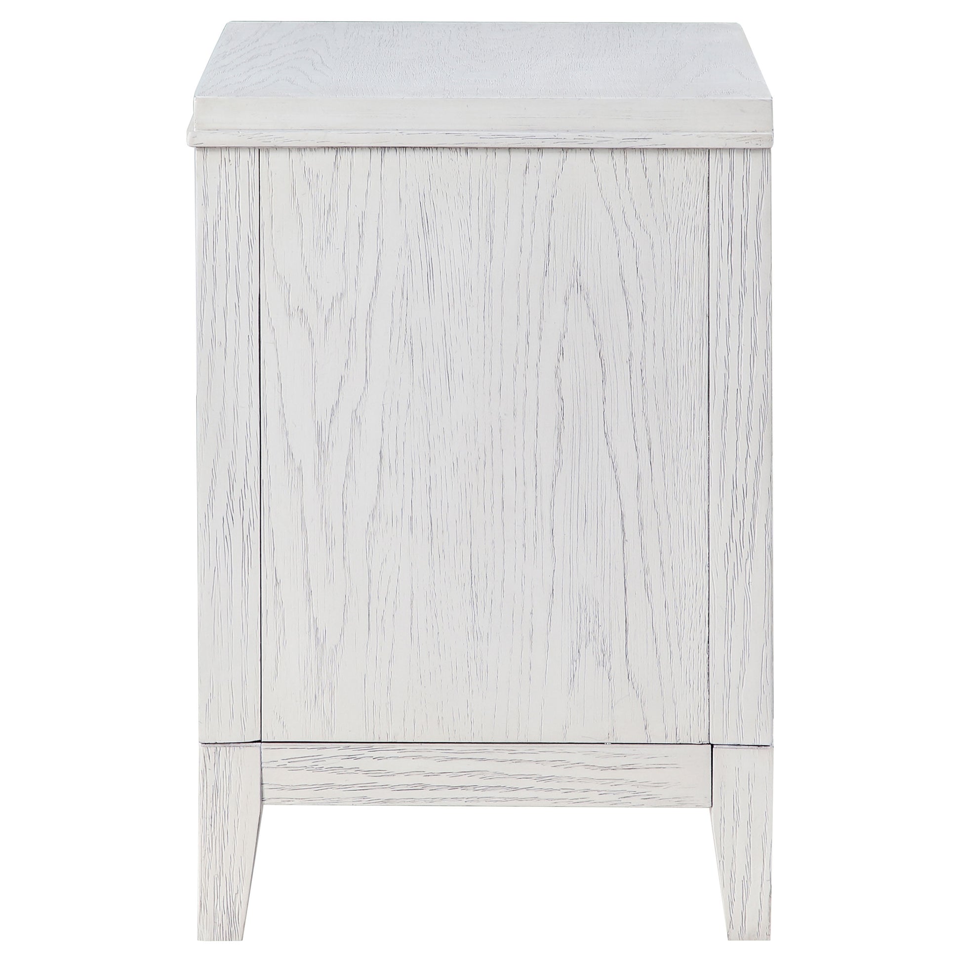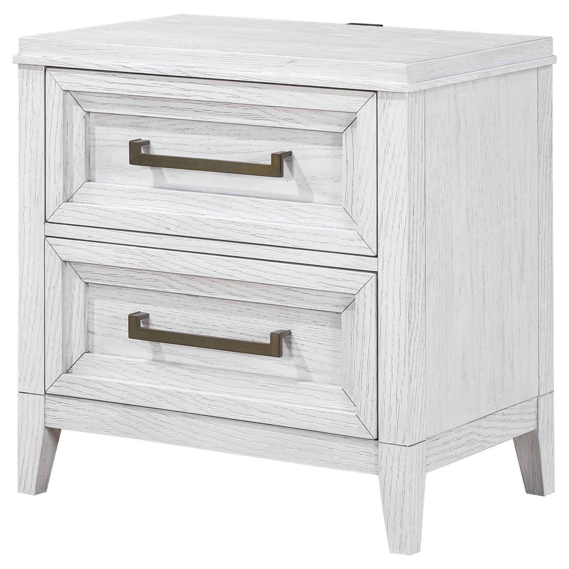 Bring fresh perspective to your bedside with a modern two-drawer nightstand. Its casual style and classic stance create a restrained look and feel, perfect for a soothing bedroom space. It features a distressed white finish over wood grain, creating subtle depth and detail. Drawers are roomy for bedside essentials, and stepped fronts add character and dimensionality. Contrasting antique brass toned bar pull complete the look, offering stylish allure in your stylish bedroom.