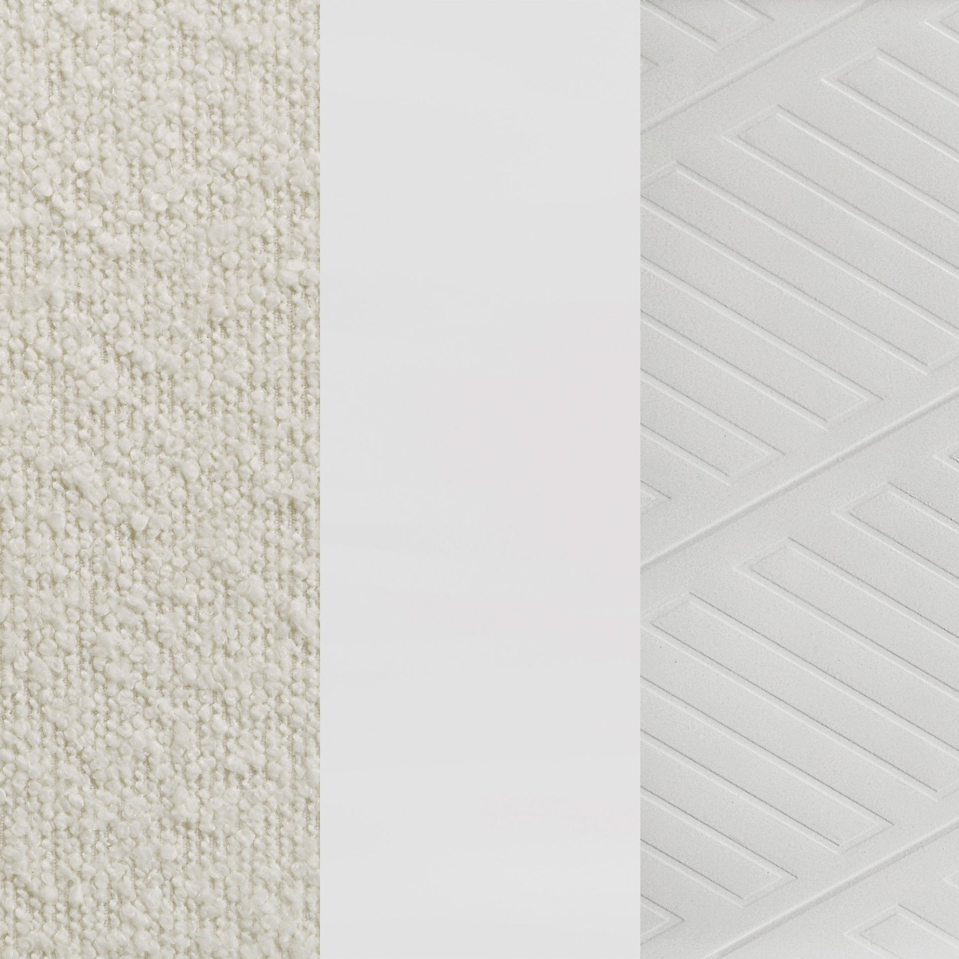 • Eastern king bed with 3-dimensional headboard upholstered in off-white boucle fabric