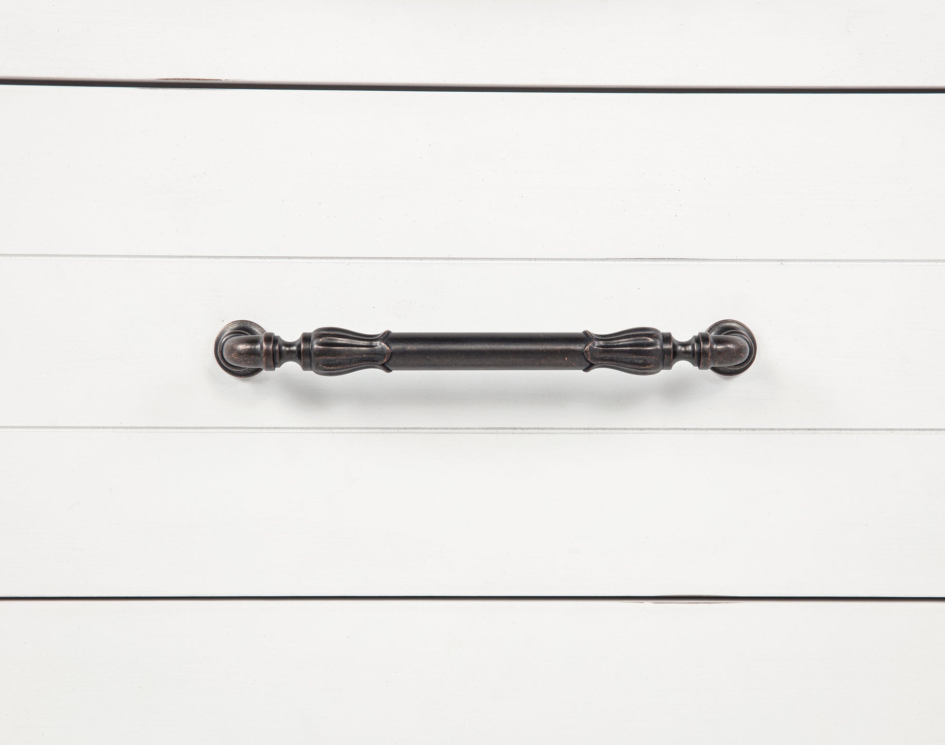 • Antique bronze drawer pulls provide contrast and decorative visual weight