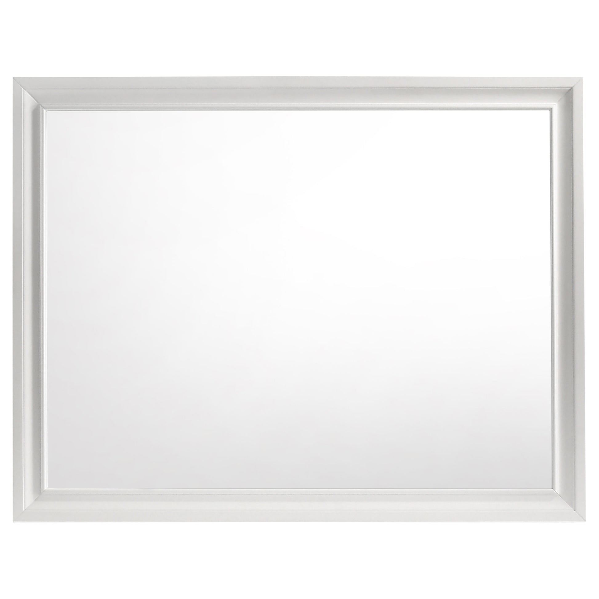 Classic yet versatile, this dresser mirror enhances any bedroom with timeless appeal. Designed with a clean, rectangular silhouette, its framed profile introduces elegant dimension and depth. A beveled glass surface adds refined visual clarity, reflecting light beautifully across the room. Built from engineered wood and finished with a protective laminate veneer, this mirror offers both durability and sophistication when paired with a matching dresser or case piece.