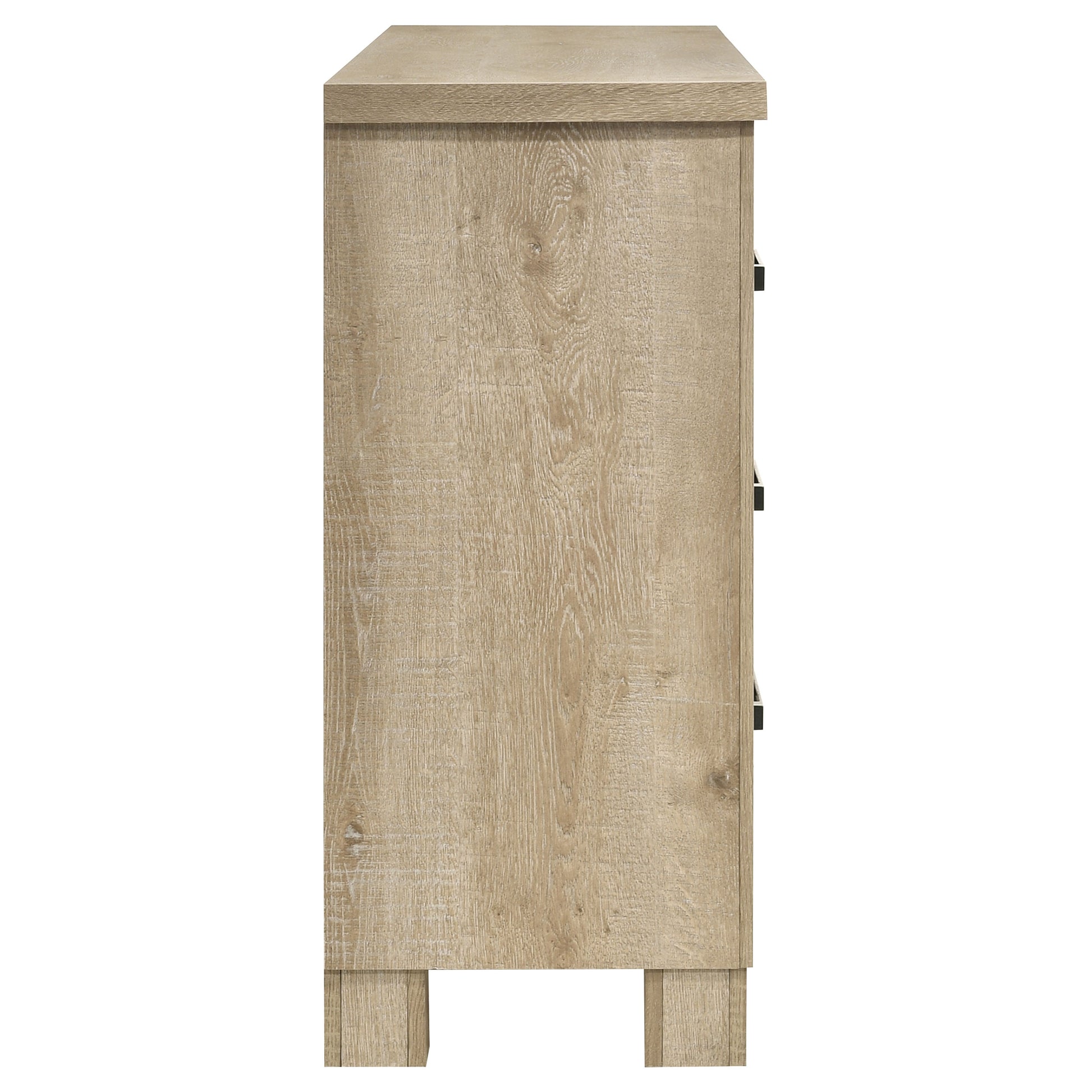 This six-drawer dresser offers a stylish blend of rustic charm and modern practicality. Featuring a weathered oak finish, it is crafted from engineered wood with a scratch-resistant veneer for long-lasting durability. Dark bronze handles provide bold contrast, while the smooth-gliding drawers offer ample space for clothing and essentials. Designed to bring warmth and elegance to your bedroom, its clean lines and generous storage make it a functional and decorative focal point for rustic or transitional interiors.