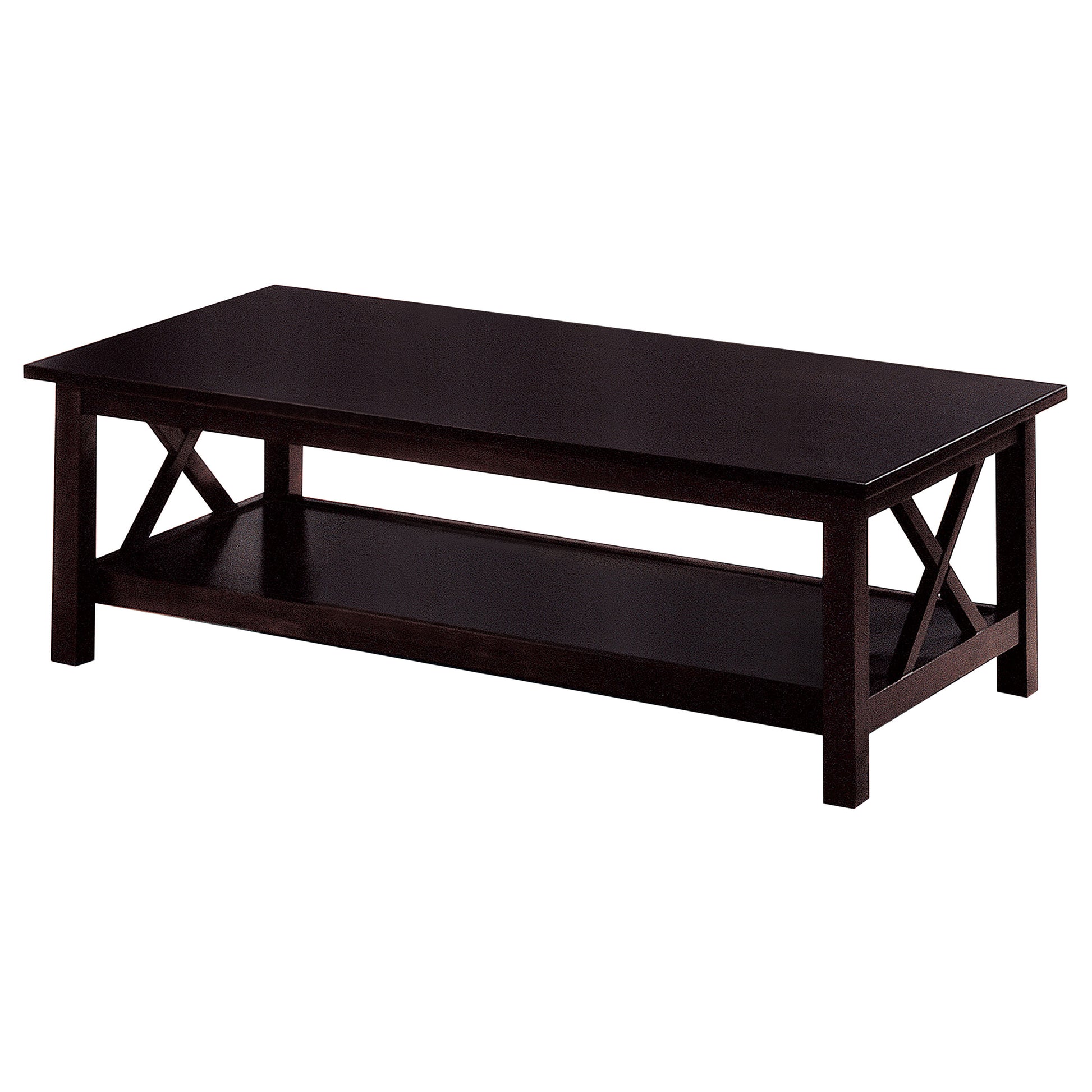 This 3-piece occasional table set includes a coffee table and two end tables, ideal for a living room or lounge. Constructed from hardwood, engineered wood, and rubberwood veneer, this set showcases a rich dark merlot finish. Each piece is designed with a lower shelf for extra storage space, while the X-shaped accents on the sides add a touch of visual appeal. This coffee table set is a perfect combination of form and function for your home.