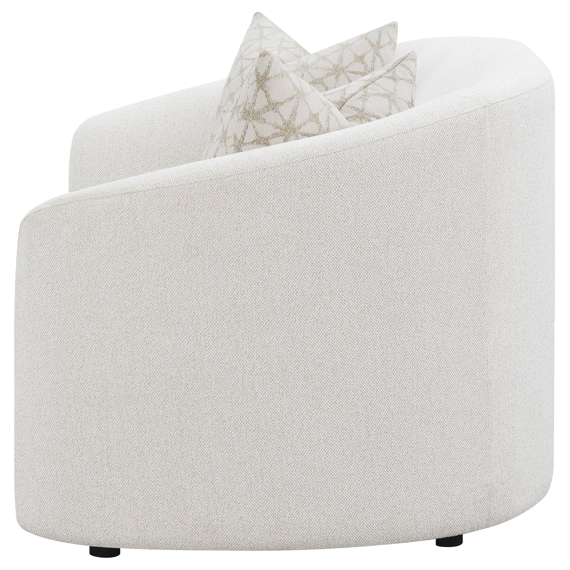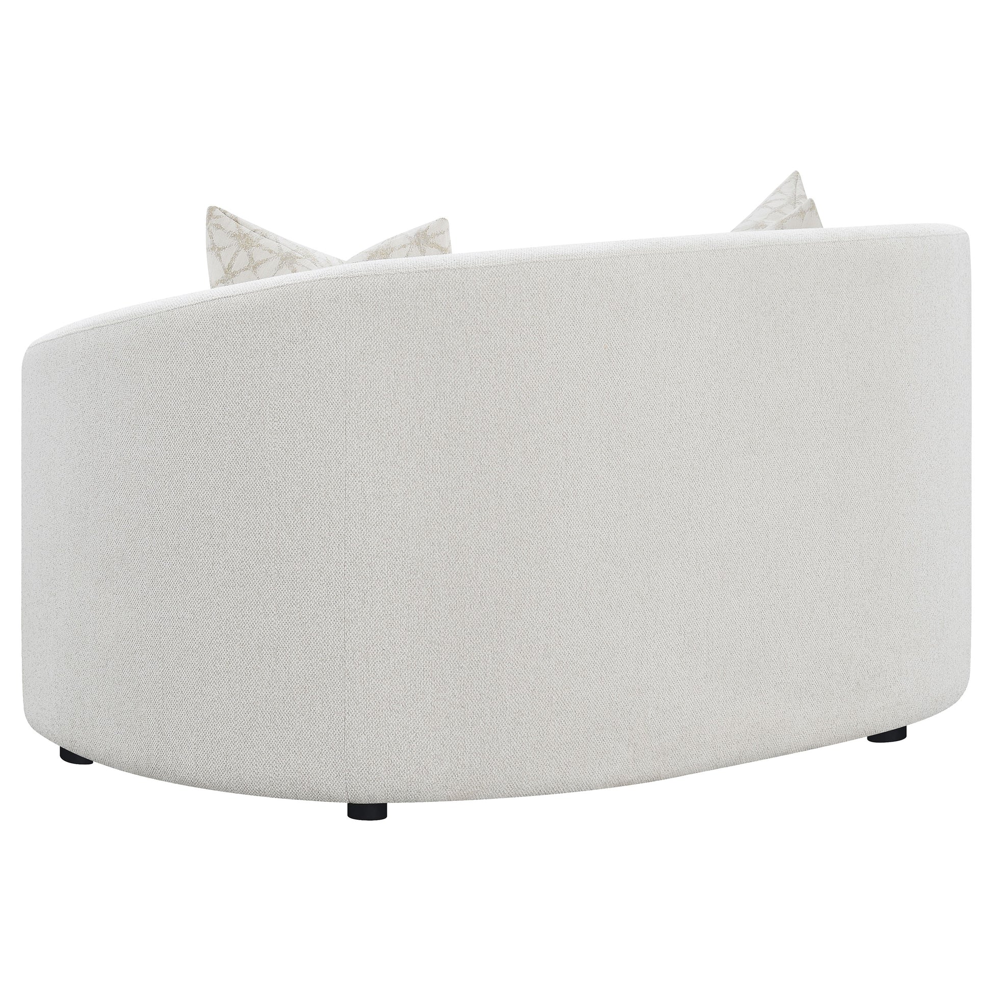 • Curved loveseat wrapped in soft latte boucle upholstery for texture