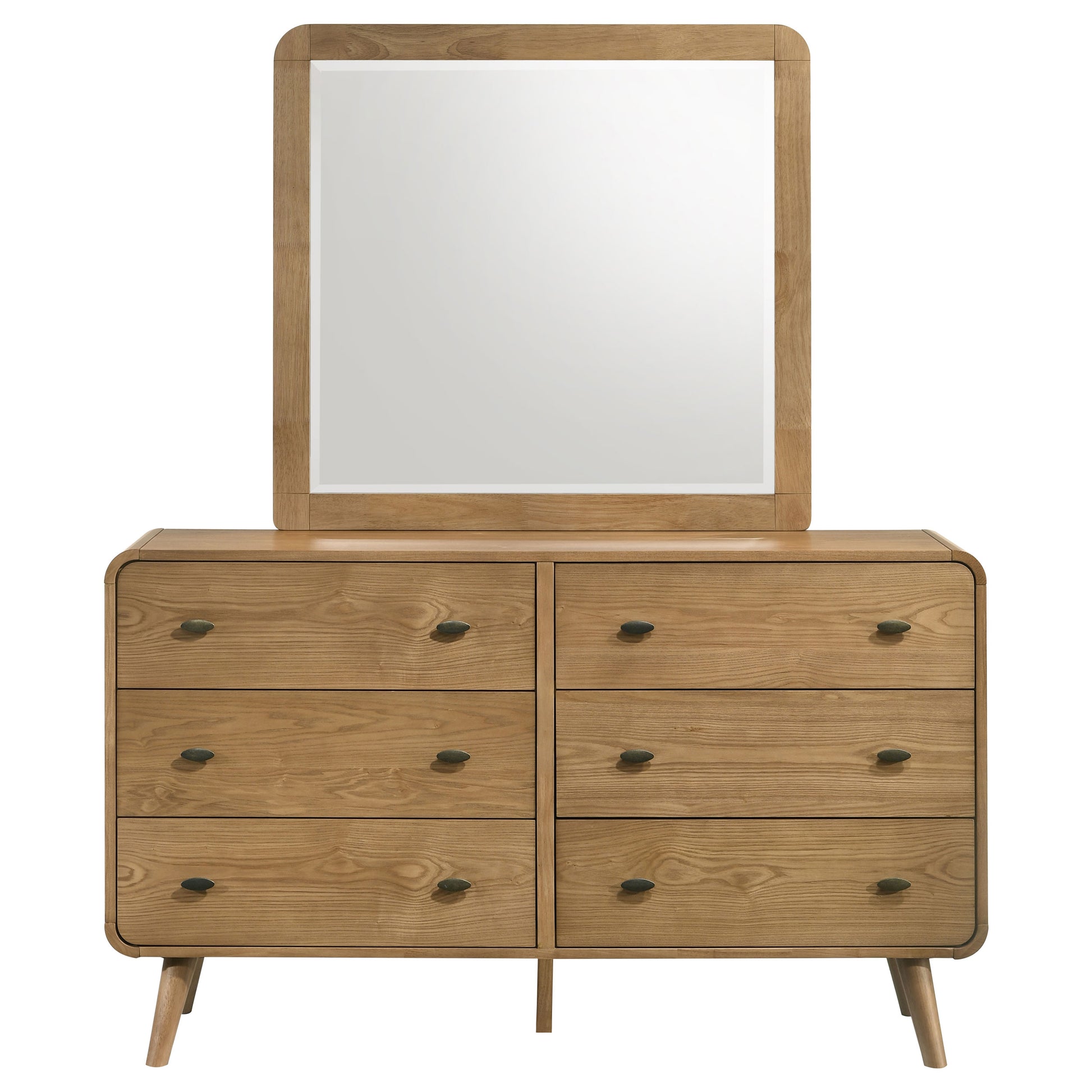 Achieve the perfect blend of style and functionality with this mid-century modern dresser and mirror set. The dresser, constructed with rubberwood, engineered wood, and ash veneer, features six spacious drawers with felt-lined top drawers for organizing wardrobe essentials. Rounded edges, tapered legs, and a clean silhouette highlight the retro-modern appeal of this timeless duo. The matching mirror completes the set with its sophisticated design and polished details.