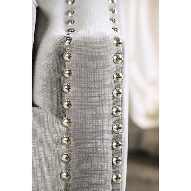 This sofa set is an inspiring combination of contemporary aesthetics and traditional designs. The gray upholstering lends to a more modern feeling sofa but elements like a nailhead trim, and button tufted padding allow this collection to fill the role of a sophisticated center piece. This collection is the embodiment of versatility and sophistication.