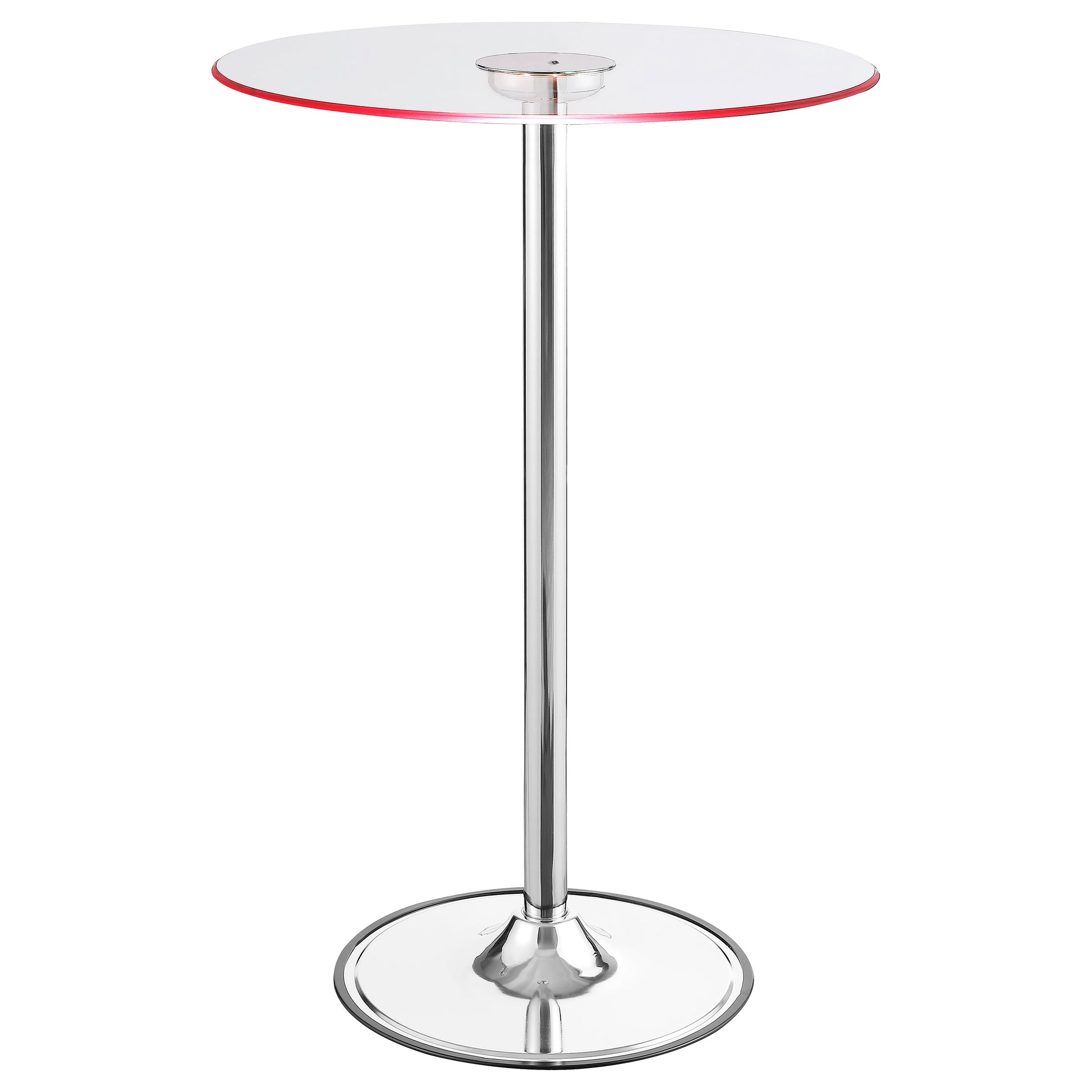 Modern appeal is evident in each and every contour of this contemporary bar table. Its pedestal base boasts a gleaming chrome finish and rounded foot. A petite tempered glass table top is clear, adding to a clean, minimalist presentation. The glass table top is further adorned with transitioning LED lights. Perfect for a compact breakfast nook or a happening home lounge.