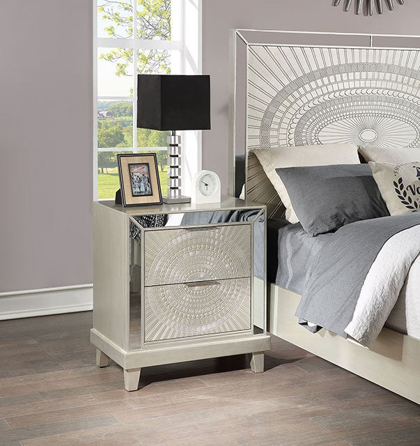 Gracing the panels of this night stand is an intricate play of radial and circular lines, engraved in polyresin material. Your eyes are drawn towards this beautiful pattern reminiscent of the art deco era. Mirror panels line each front edge, adding to the luxurious appeal. On top of that, the classy champagne finish exudes subtle warmth that makes this night stand, even in its grandeur, still plenty welcoming.
