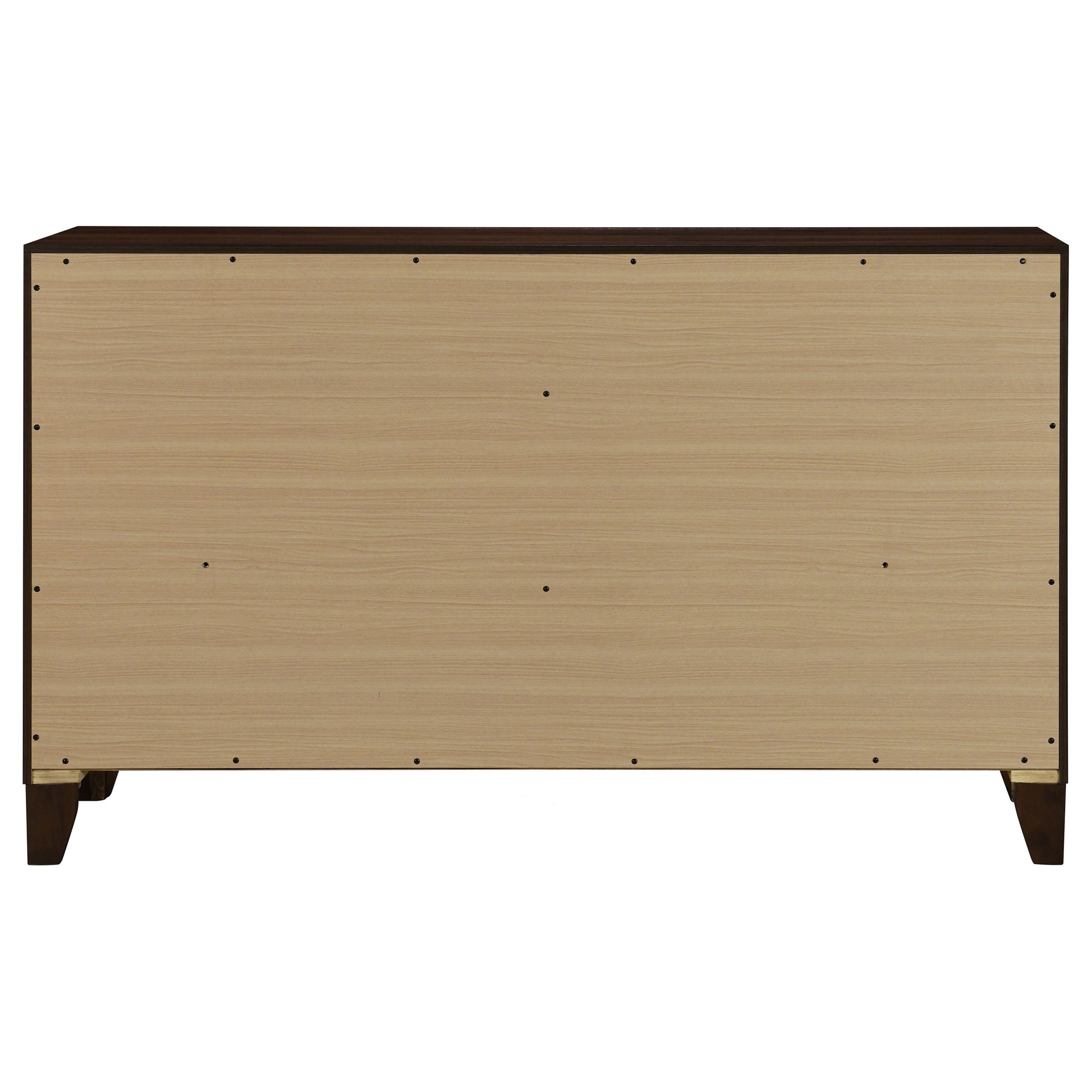 Create easy storage and organization in your bedroom with a modern six-drawer dresser. Its familiar silhouette provides a spacious top, perfect for decor or a jewelry box to add a personalized touch. The dresser boasts a rich walnut wood grain finish over laminate surfaces, delivering excellent durability and resistance to daily wear and tear. Drawer fronts are accentuated with gold finish round knobs, adding a glam touch of sophistication. Mitered trim surrounds the case and tapered block legs are a perfect complement, adding precision and movement in a stylish space.