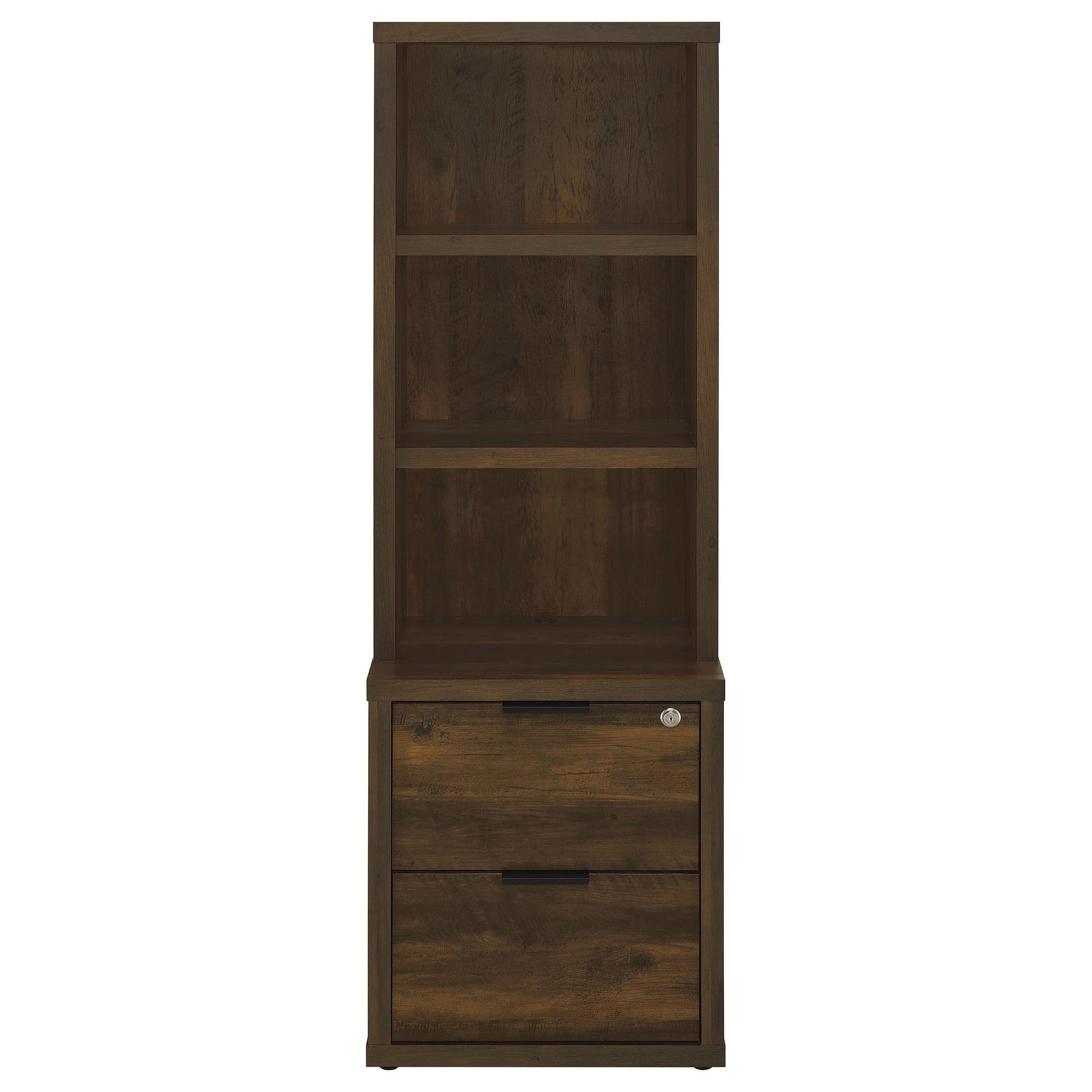 This 3-piece bedroom set includes a bookcase headboard and two coordinating nightstands designed for practical bedroom storage. Open cubbies on the headboard and hutches keep books and essentials within reach, while lockable top drawers add secure storage. Each nightstand features built-in USB-A and USB-C charging ports. Made from engineered wood and finished in a scratch-resistant laminate veneer, the set delivers durability and everyday convenience across a range of room styles.