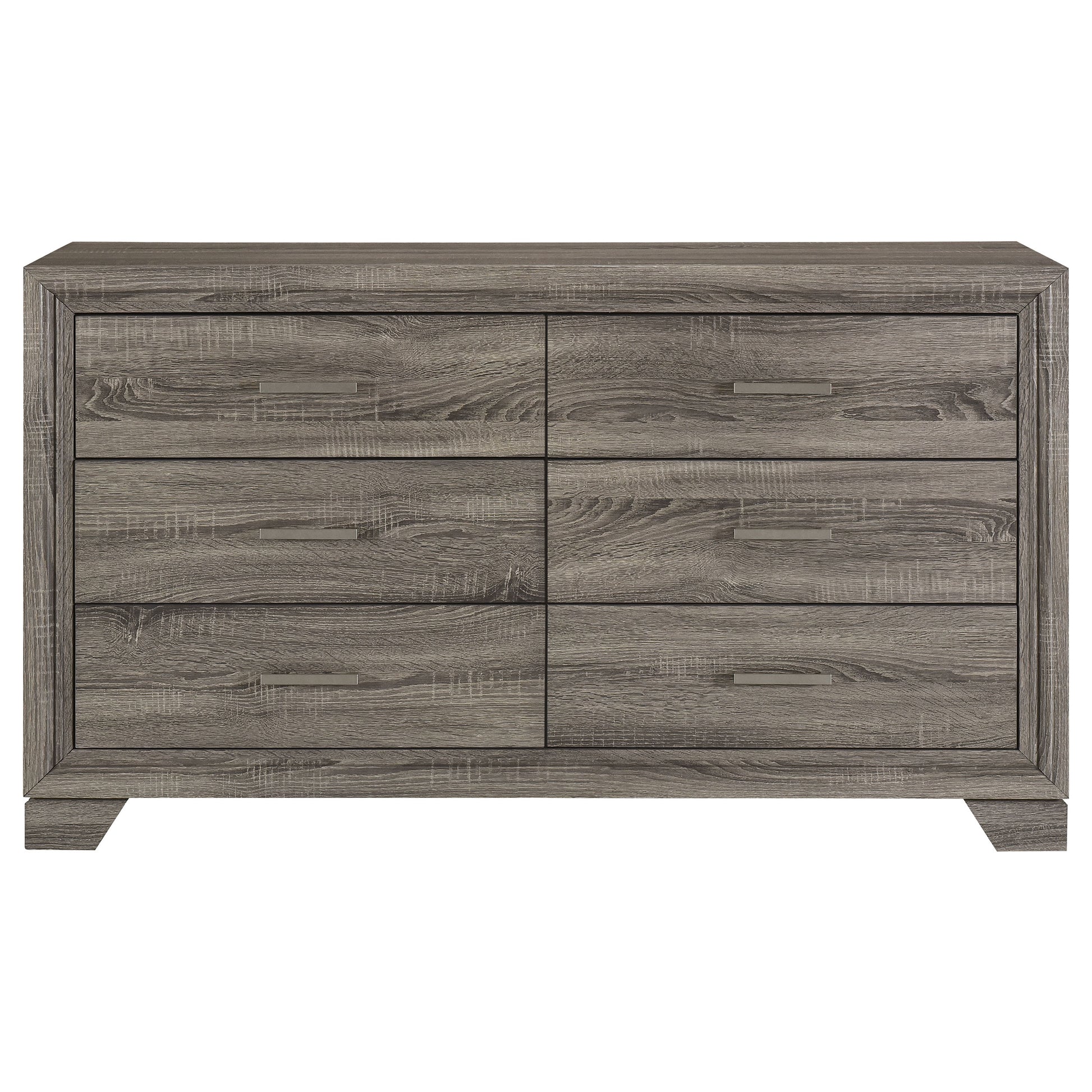 Introduce gracious style in an approachable, tailored bedroom suite with this transitional six-drawer dresser. Designed to augment clothing and accessory storage, it's built with six roomy drawers, all complete with center metal glides for smooth performance. Its exterior features engineered wood and laminate construction, creating durability and reliability. Its case is encased in mitered trim and stands on singular block legs, adding a sense of precision and character. Bar handles complete the stylish look while its wide top allows for a curated selection of decor brings a personal touch.