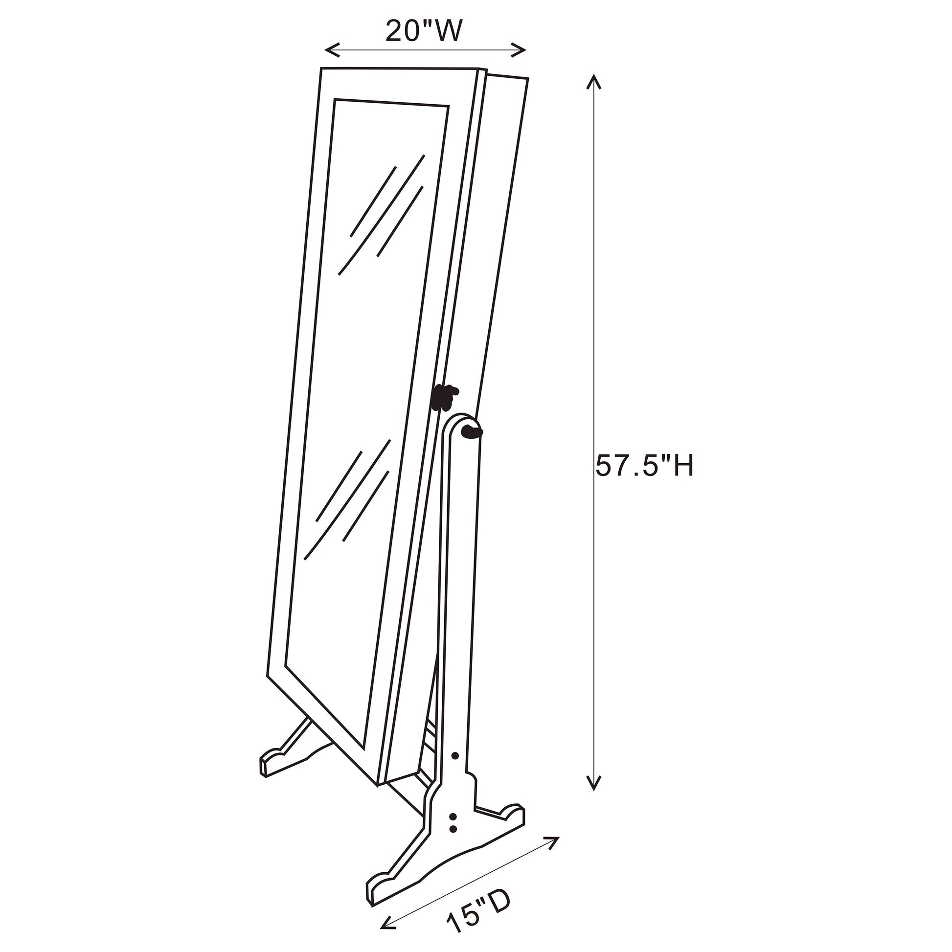 This impressive jewelry Cheval mirror is more than just a pretty face. At almost five feet tall, this tilting mirror has enough mirror space to ensure that you can check your outfit from head to toe. It opens up to storage space consisting of three lower horizontal shelves and hooks and right holders that hold all your valuables with ease. A built-in, four-inch deep jewelry box safeguards other precious accessories. It's finished in a handsome dove grey that matches any decor.