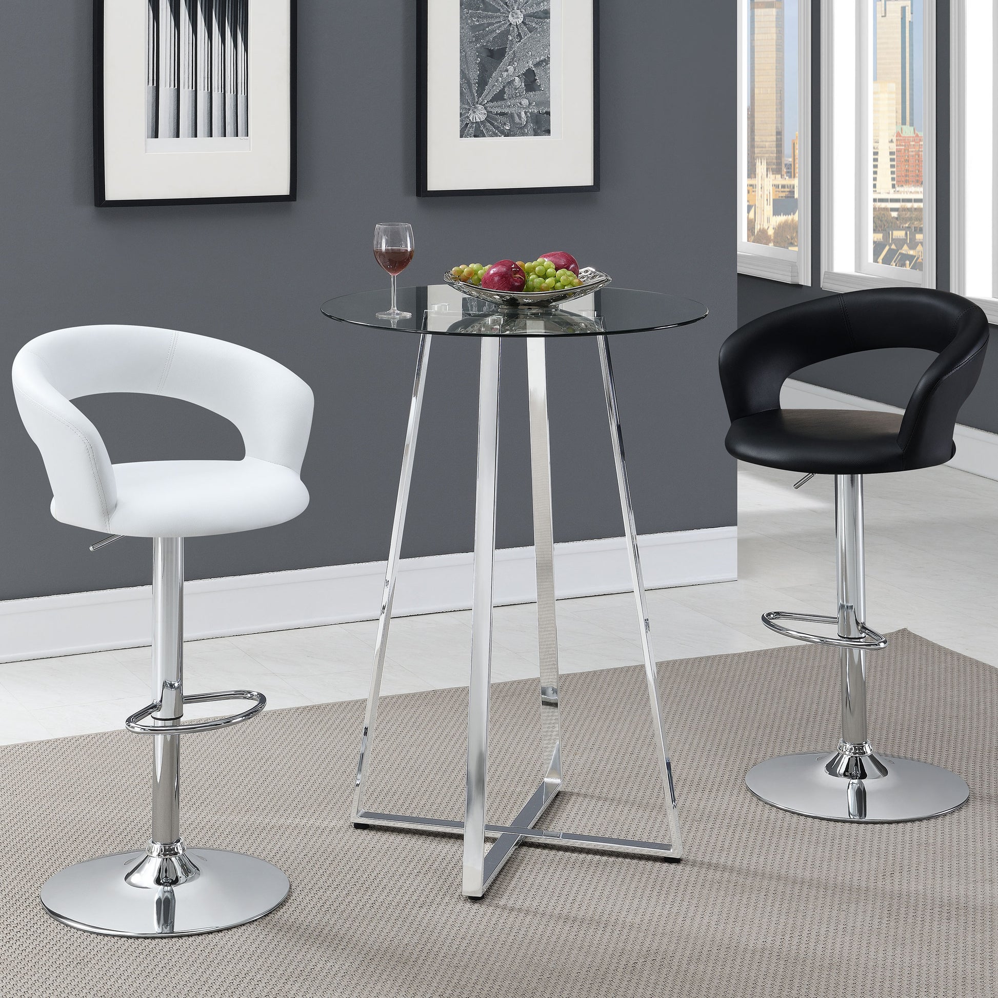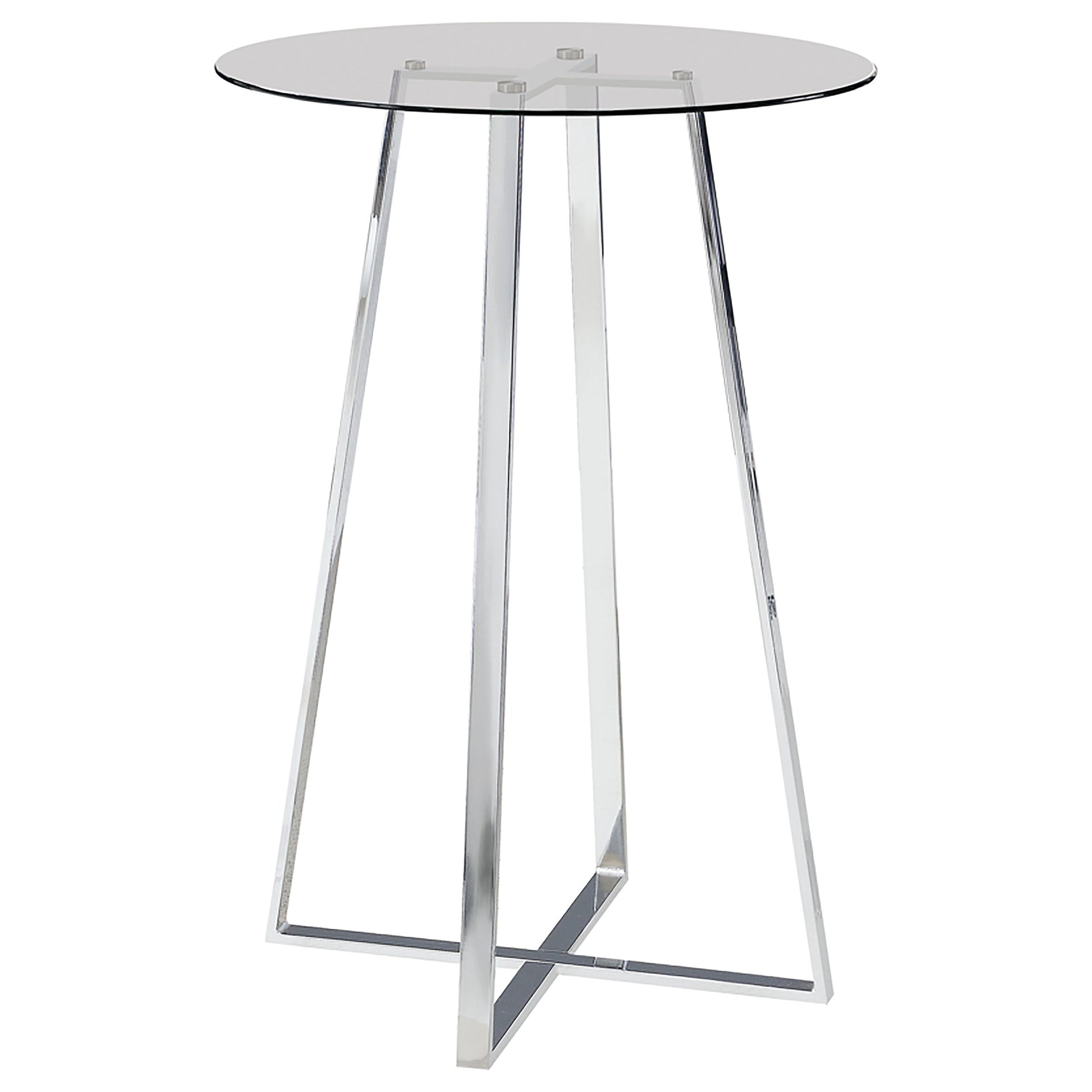 Whether you're sitting down to an intimate dinner or enjoying a cocktail with friends, this contemporary bar table helps you entertain in style. Its compact size allows for a variety of placement options, making it ideal for a small kitchen or dining area. An attractive yet simple design blends seamlessly with any home decor. Smooth, clean, tapered lines and a gleaming chrome finish give it a pleasingly modern appearance. A round, clear, tempered glass top completes its elegant look